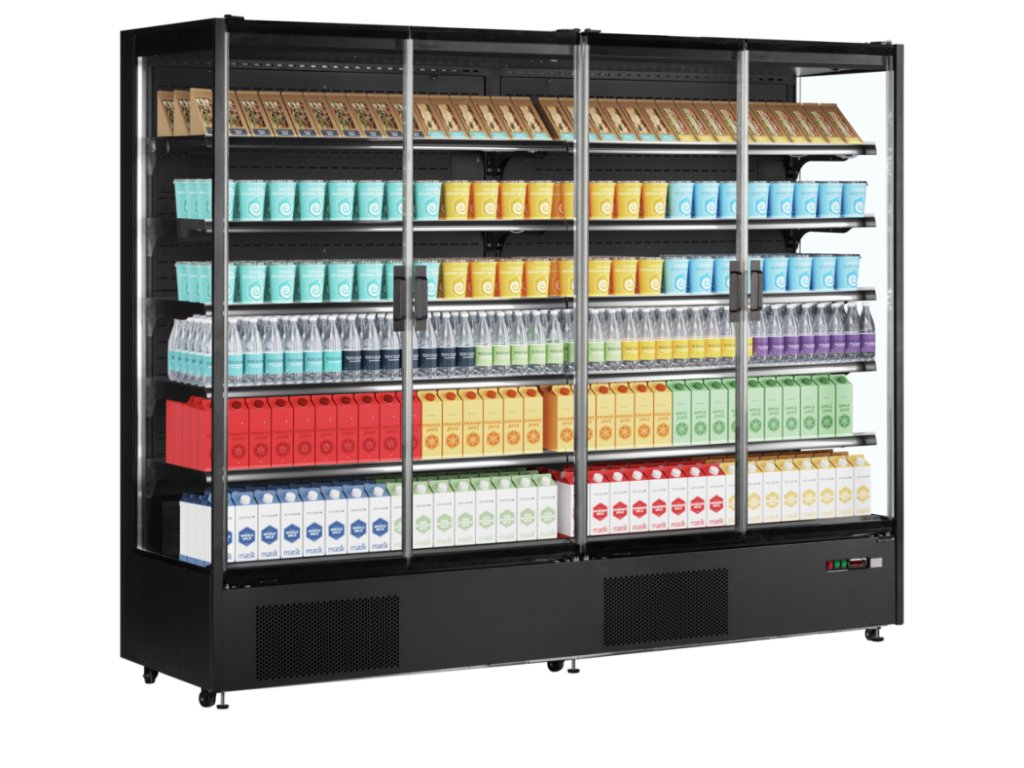 bezrámové prosklené dveře pro skvělou viditelnost výrobků, nízká spotřeba energie, černý interiér a exteriér, nastavitelné police se sklopnou funkcí, LED osvětlení pod každou policí, ventilované chlazení pro rychlé snížení teploty a zajištění rovnoměrné teploty, digitální termostat a teplotní displej, boční stěny standardně prosklené, transparentní cenovkové lišty o výšce 33 mm , kolečka a nastavitelné nožičky