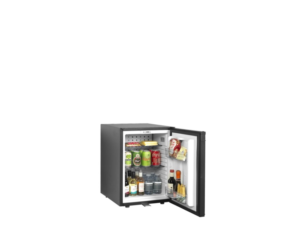 Tento kompresorový minibar s plnými dveřmi je vynikající volbou pro hotely v teplejším prostředí. Chladicí systém pomáhá zajistit nižší teplotu a kratší dobu pro dosažení požadované teploty ve srovnání s absorpčními minibary. Má také několik skvělých programovacích funkcí. Lze jej nastavit tak, že kompresor běží pouze v době, kdy je pravděpodobné, že bude místnost prázdná, např. od 9 do 12 hodin a od 18 do 21 hodin. To znamená, že v jiných časech, kdy je pravděpodobné, že se v místnosti zdržují hosté, je v ní naprosté ticho. Takzvaný water-pack udržuje v minibaru nízkou teplotu, i když není v provozu. Kromě toho také nabízí režim SLEEP pro zajištění ticha a funkcí FAST-cool pro okamžité chlazení. To je velmi praktické, pokud hosté přijedou v neobvyklou dobu. Minibar má černý vnější povrch a je navržen tak, aby byl elegantně nenápadný. Lze jej také plně integrovat pomocí vestavěného držáku a sady pro upevnění pantů, které umožňují společné otevírání dveří skříňky a minibaru (nejsou součástí). Stabilitu minibaru zajišťuje také sada pro upevnění pantů, která zabraňuje jeho převrácení a posunutí dopředu.nízká spotřeba energie, kompresorový chladicí systém, provoz s nízkou hlučností, funkce časování pro maximální pohodlí hostů, režim SLEEP-mode pro extra tichý chod při spaní, funkce FAST-cool pro okamžité chlazení, nastavitelné police, také ve dvířkách, plné dveře, lze měnit otevírání, vnitřní LED osvětlení, integrované madlo, zámek