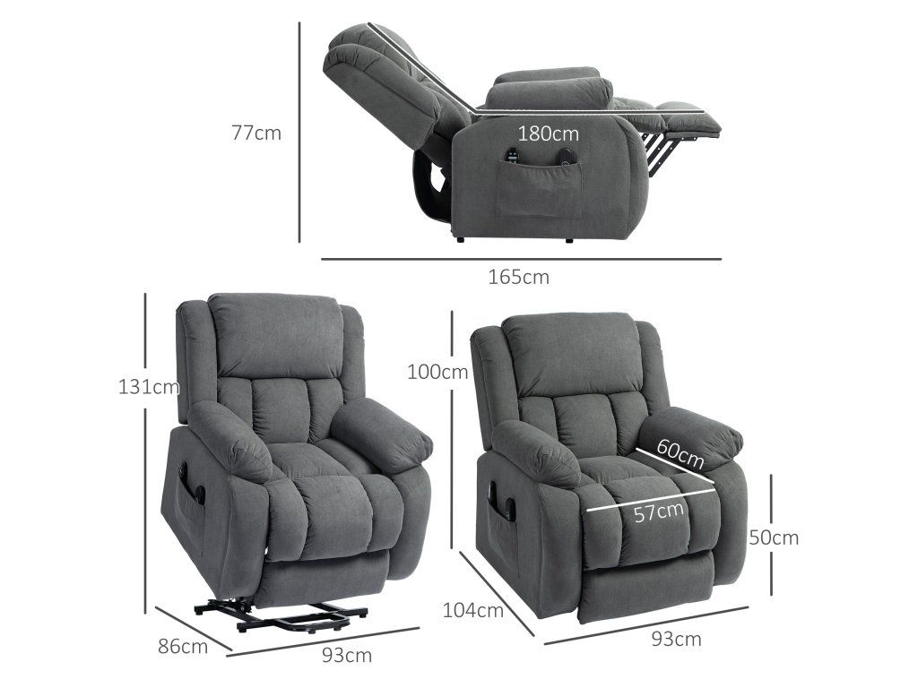 - Bez námahy ve stoje i v leže: Toto elektrické zvedací křeslo vás jemně zvedne do téměř stojící polohy nebo nakloní až do úhlu 150°, to vše ovládané dálkovým ovladačem s USB portem pro nabíjení mobilního telefonu