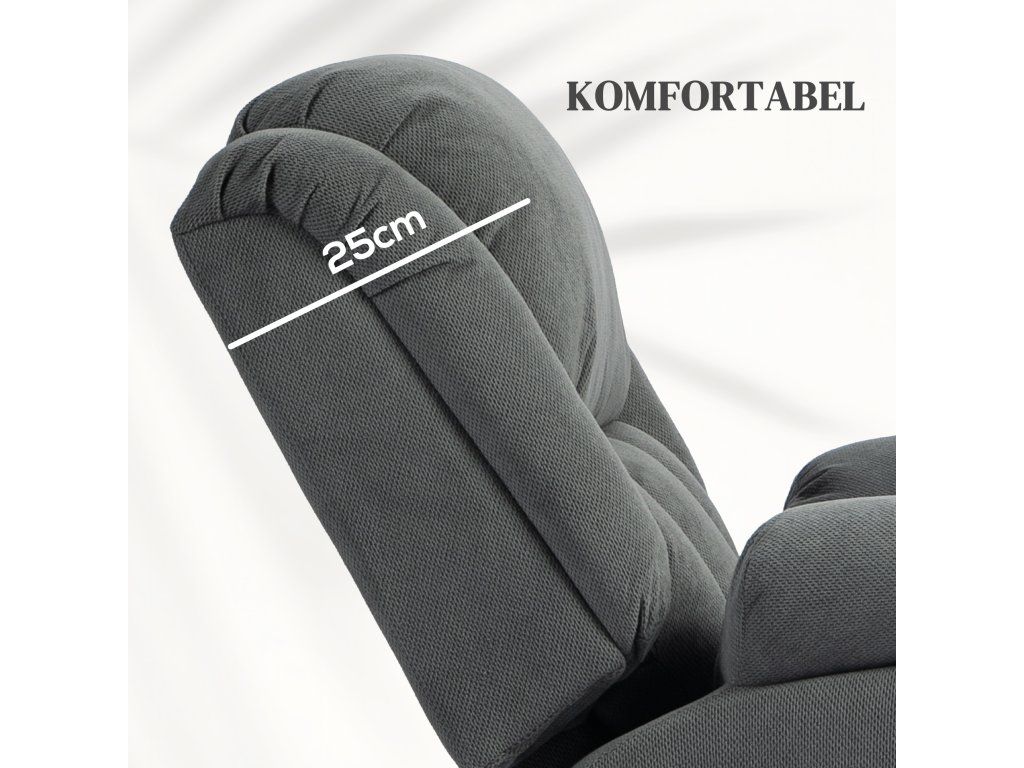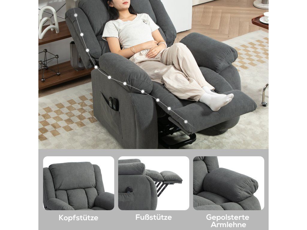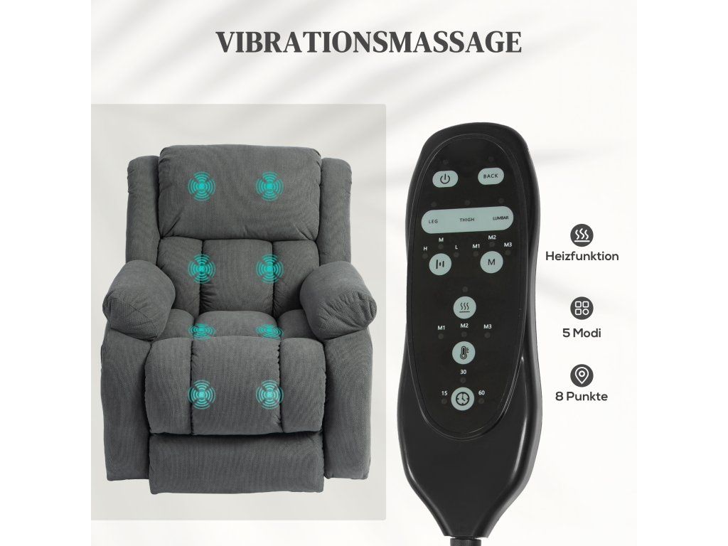 - Relaxační masáž: Toto televizní křeslo s pomůckou na postavení je vybaveno 8 vibračními masážními body a nabízí cílenou relaxaci pro vaše záda, bedra, stehna a nohy, včetně vyhřívání bederní části a pěti různých úrovní masáže