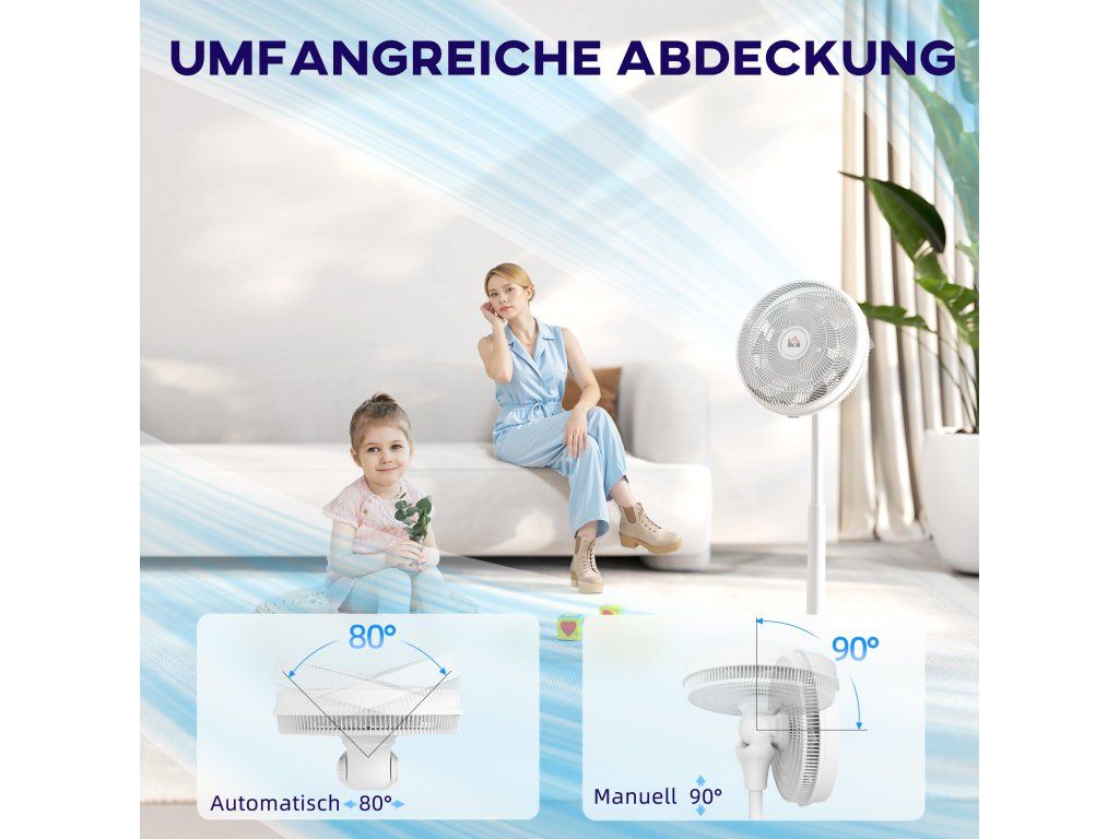 ✔ Automatická oscilace 80° a manuální naklápění 90° pro široký dosah.