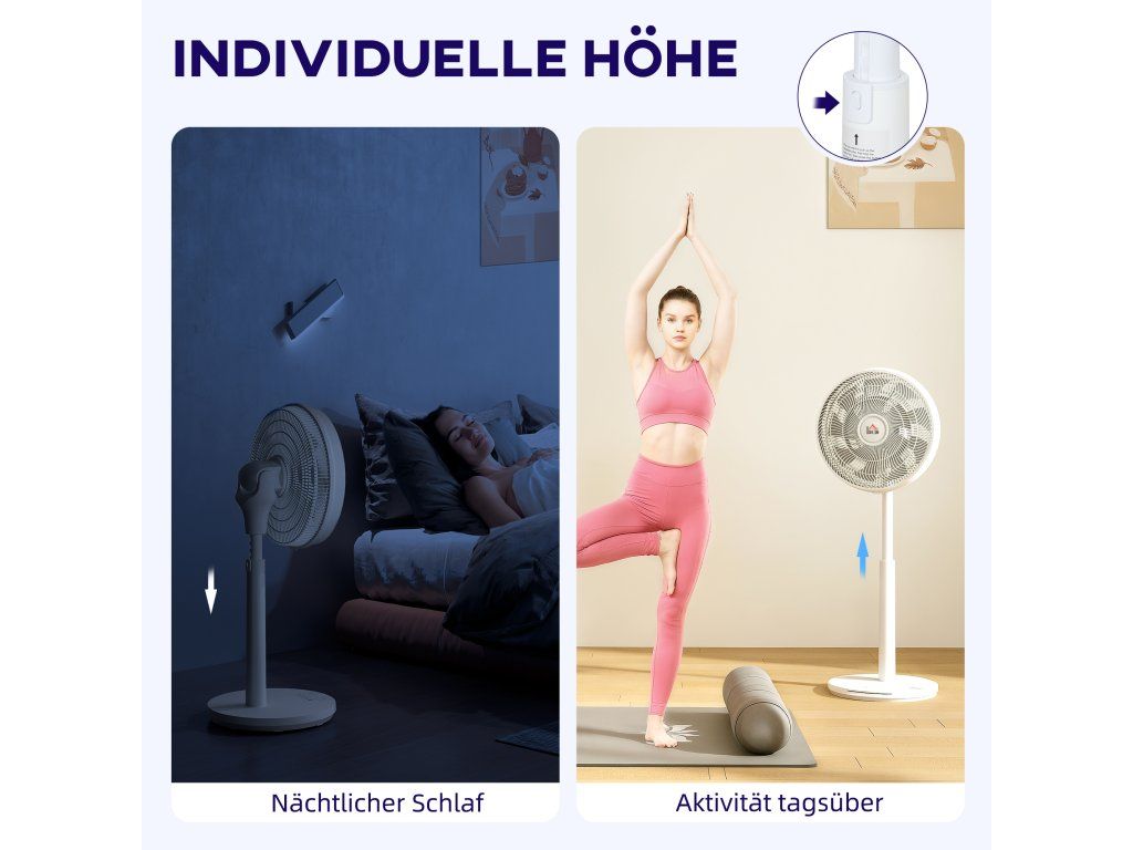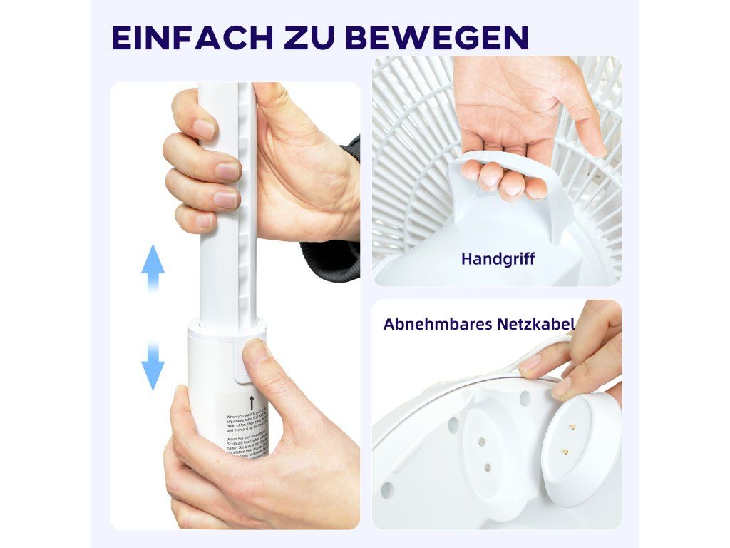 Široký dosah: Užijte si chlazení s automatickou horizontální oscilací 80°, ručně nastavitelným vertikálním náklonem 90° a nastavitelnou výškou 90–110 cm. Tento velký ventilátor je ideální pro komplexní větrání v obývacích pokojích, ložnicích nebo domácích kancelářích.