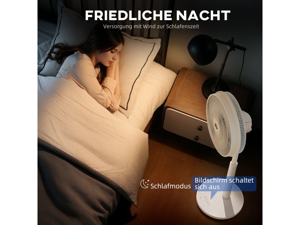 Energeticky úsporné chlazení: Tento elektrický stojanový ventilátor využívá stejnosměrný motor k generování silného proudění vzduchu a zároveň šetří energii. Pracuje velmi tiše s hlučností pouhých 30 dB, ideální pro nerušené noci nebo soustředěnou práci.