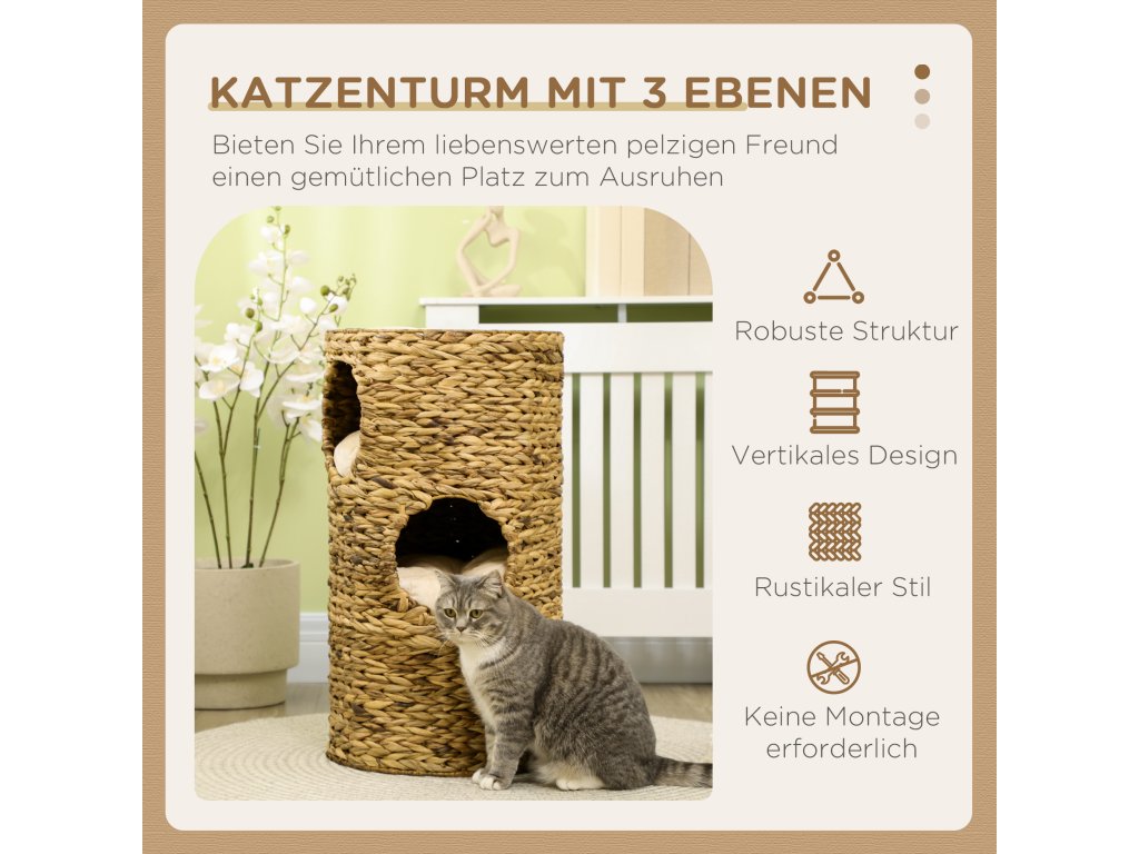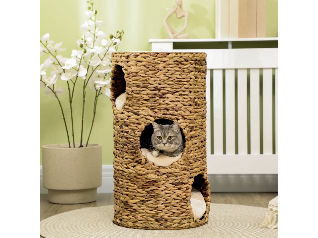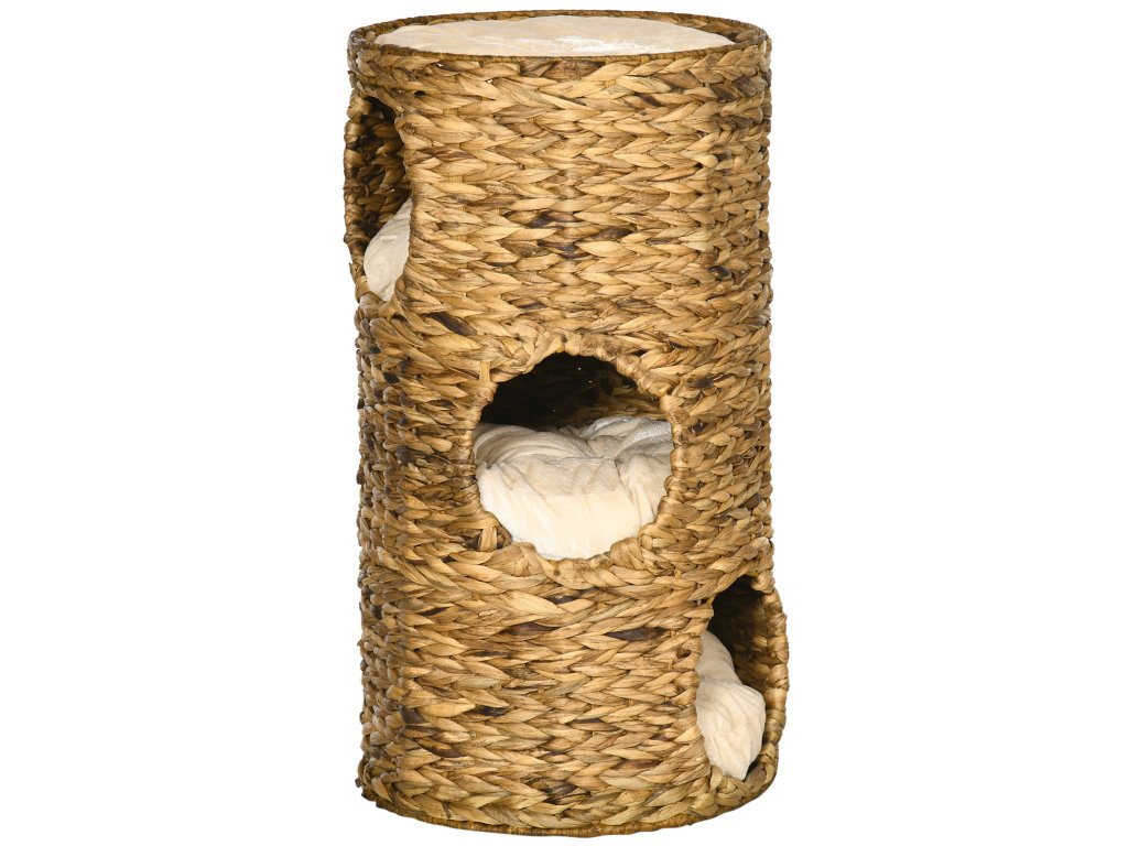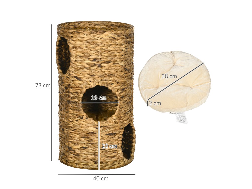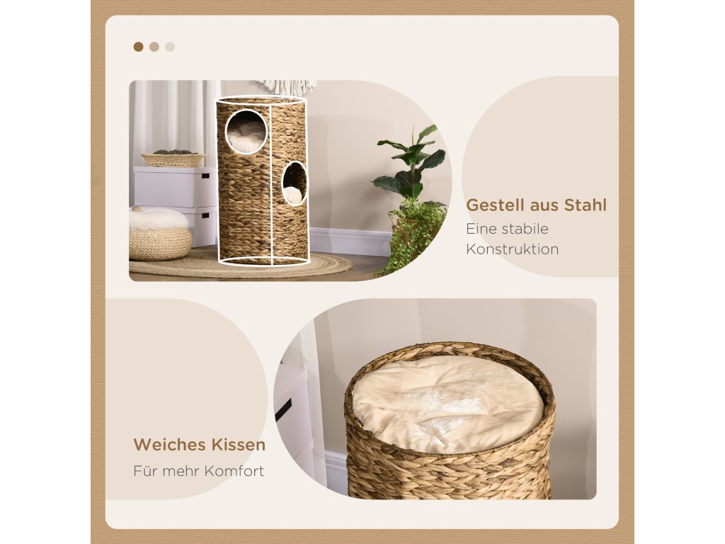 Tlapková jeskyně PawHut se 3 úrovněmi, 3 vchody, boho design, včetně polštáře, 40 cm x 40 cm x 73 cm, světle hnědá + krémově bílá