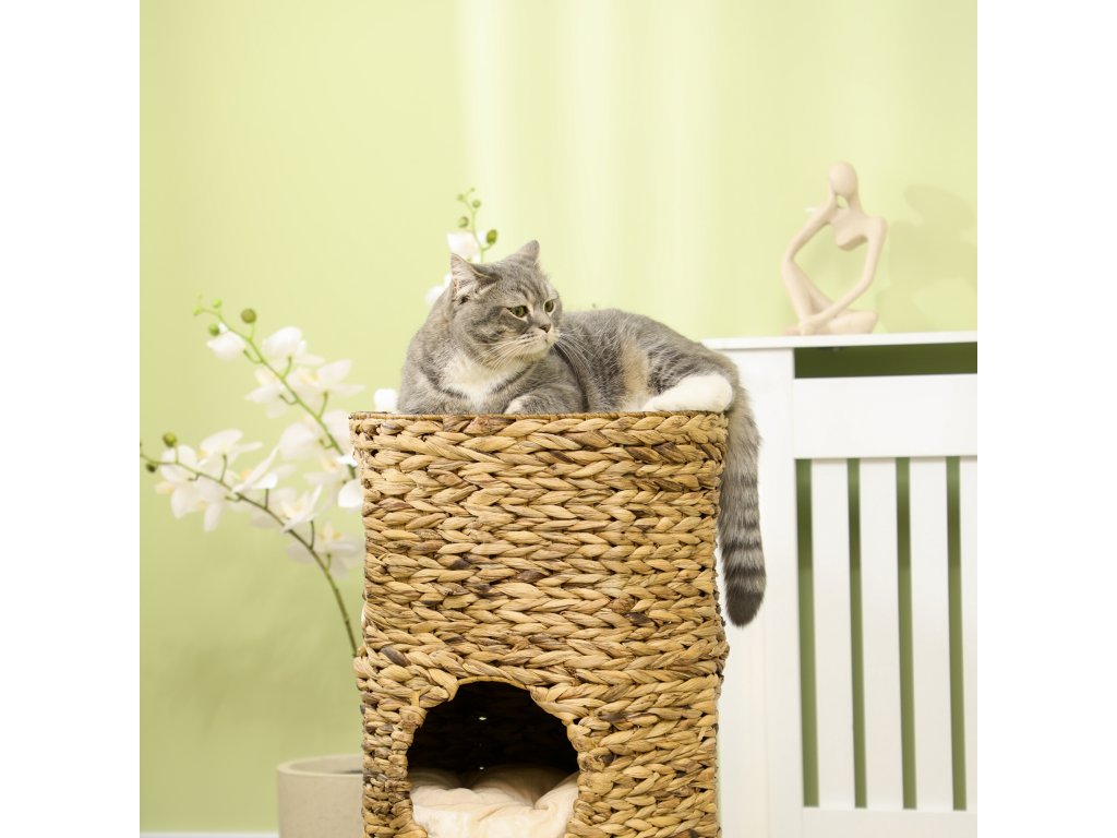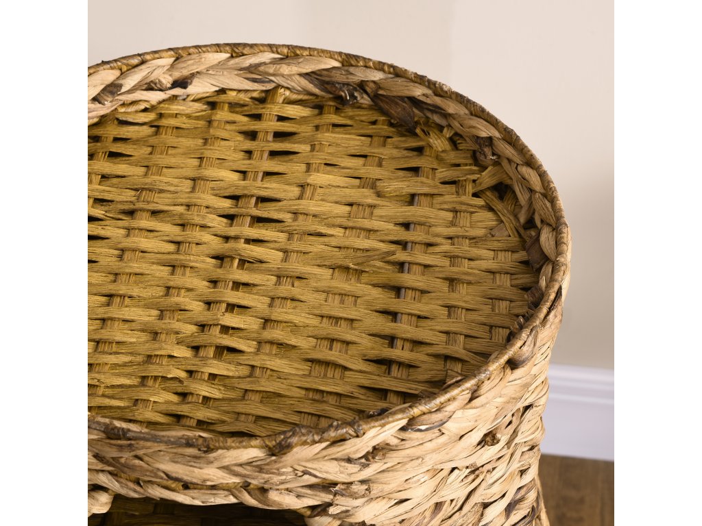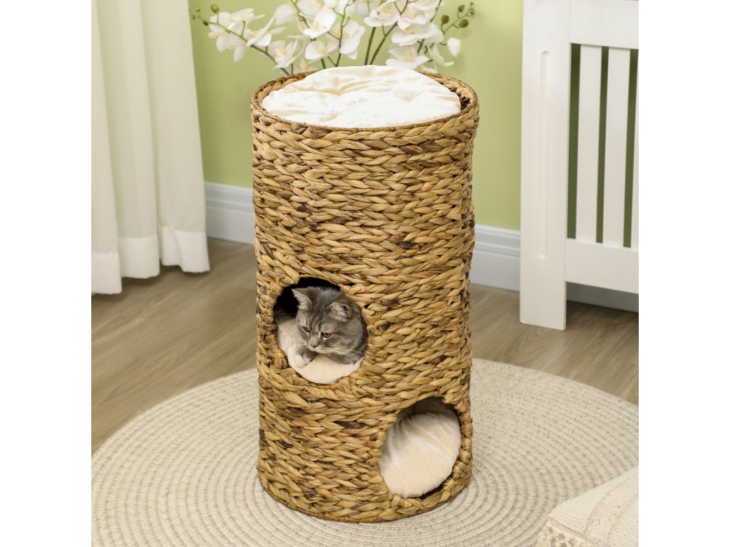 - Přírodní kouzlo: Sud pro kočky je zabalen do výpletu z vodního hyacintu, který do vašeho domova vnese stylovou přírodní estetiku. Tento ekologicky šetrný materiál se bez problémů začlení do jakéhokoli interiéru