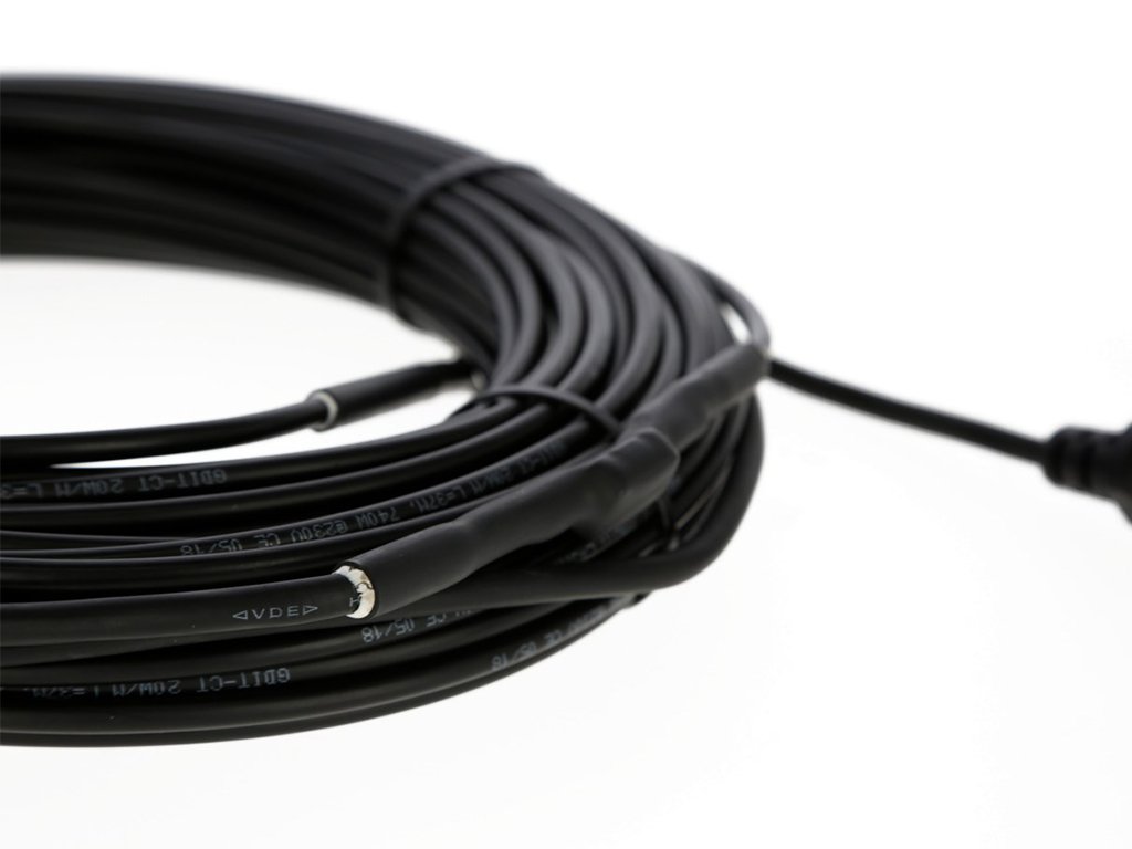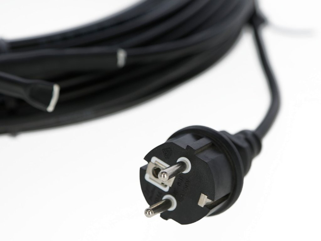 Topný kabel s termostatem, proti zamrzání, pro okapy a potrubí, teplota sepnutí +3°C, teplota vypnutí +12°C, krytí IPX7, mechanická pevnost M2, napětí 230V, výkon 500W, délka topného kabelu 25m, délka napájecího kabelu 2m.