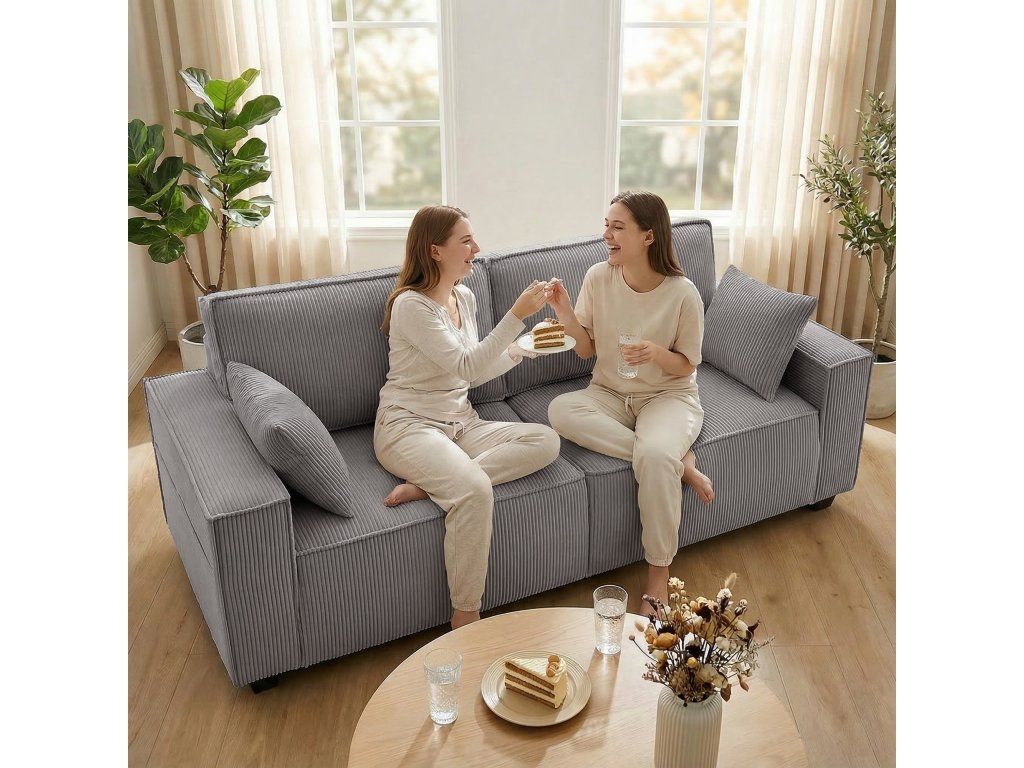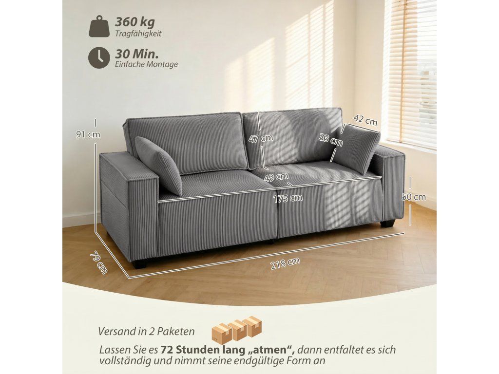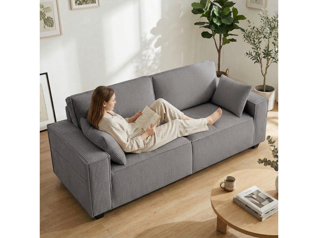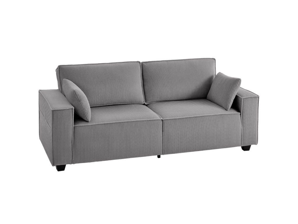 Pohodlný manšestr a polštáře: Silná, odolná manšestrová tkanina pohovky je měkká a teplá. Světle šedý odstín harmonicky zapadne do každého obývacího pokoje. Dva polštáře poskytují pohodlí pro vaše záda nebo krk – ideální pro relaxaci.
