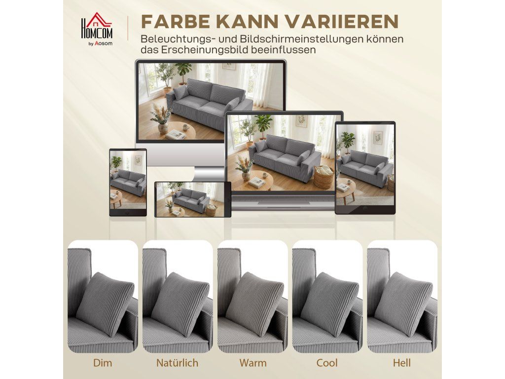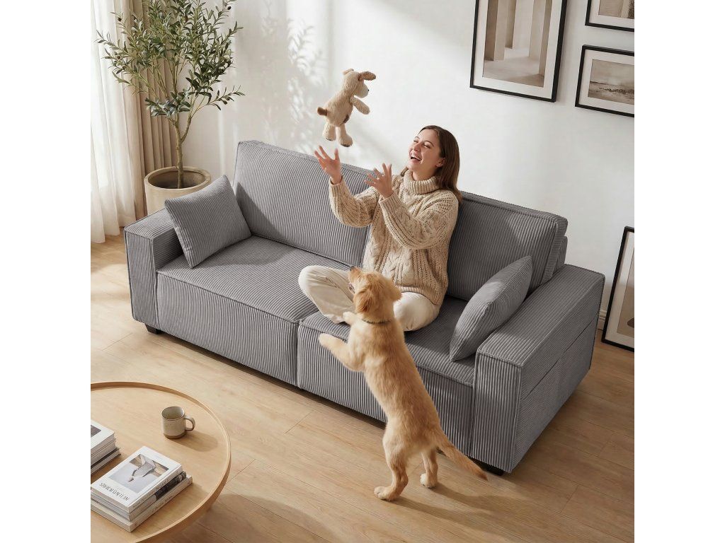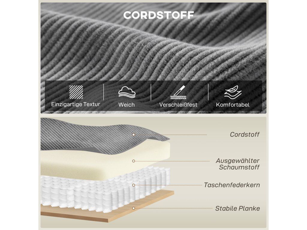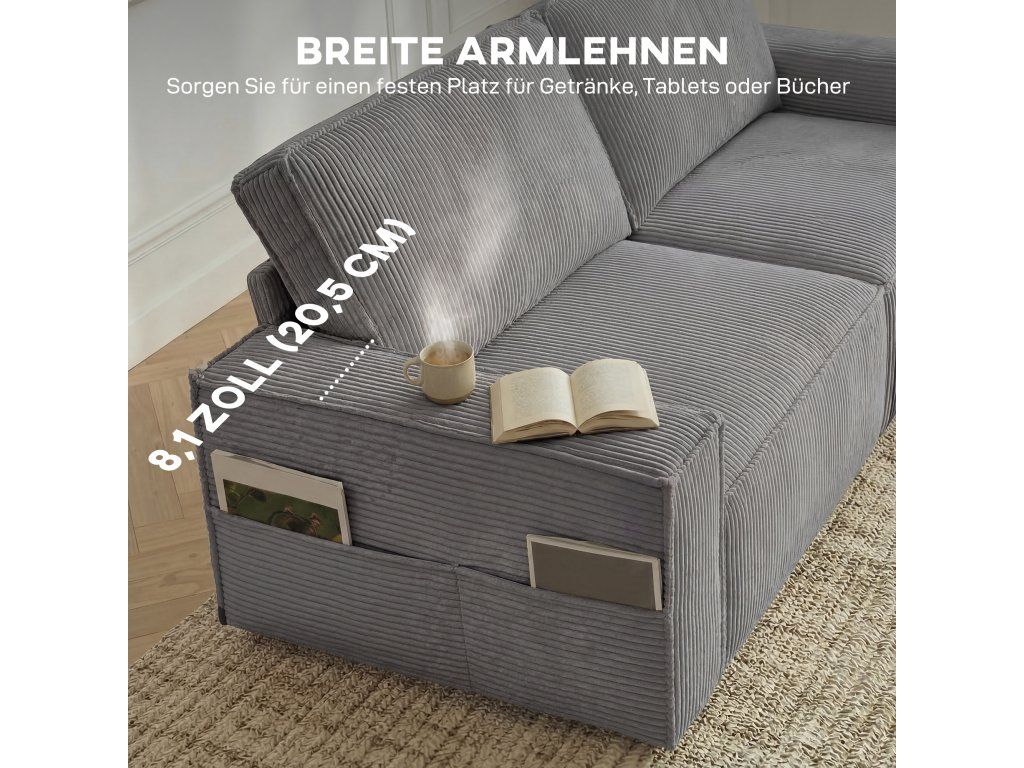 Pohodlný manšestr a polštáře: Silná, odolná manšestrová tkanina pohovky je měkká a teplá. Světle šedý odstín harmonicky zapadne do každého obývacího pokoje. Dva polštáře poskytují pohodlí pro vaše záda nebo krk – ideální pro relaxaci.