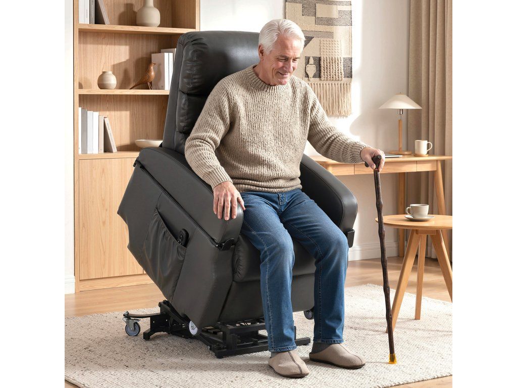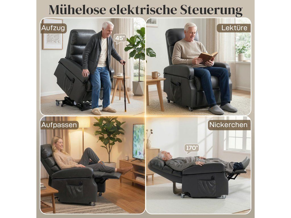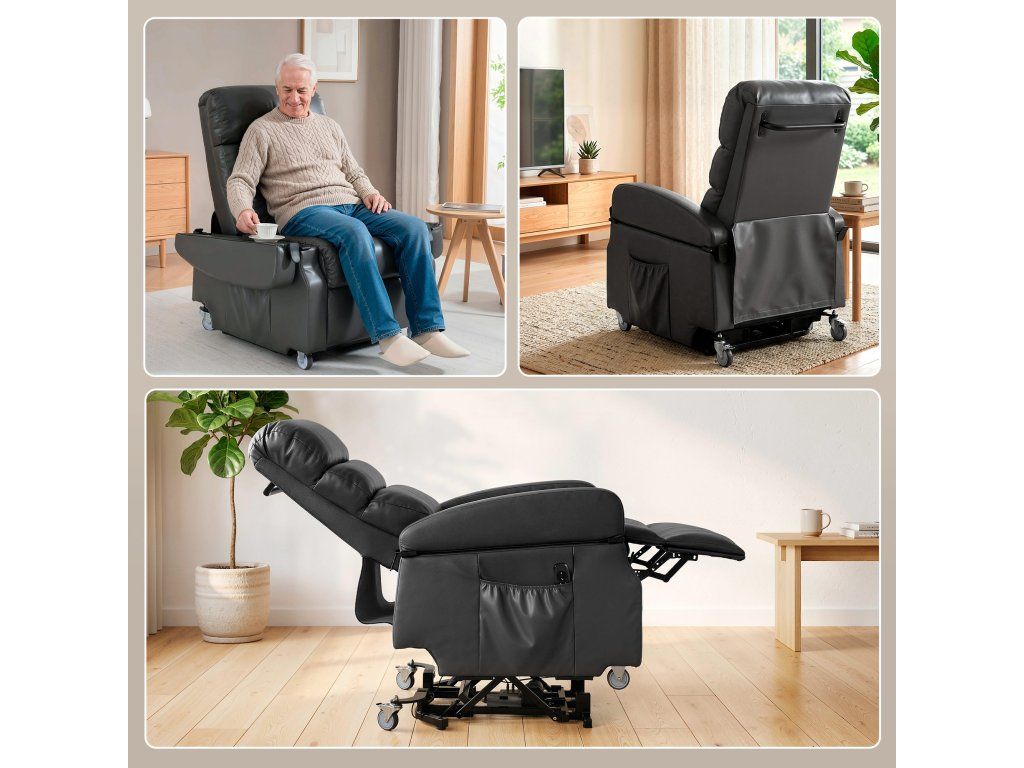 Jemná elektrická asistence při stání: Toto polohovací křeslo, speciálně navržené pro seniory nebo osoby s omezenou pohyblivostí, vás jemně zvedne až do úhlu 45° pomocí dálkového ovladače, což vám umožní bezpečně a bez námahy vstát. To snižuje zátěž kolen a zad a poskytuje cennou nezávislost a pocit důstojnosti.