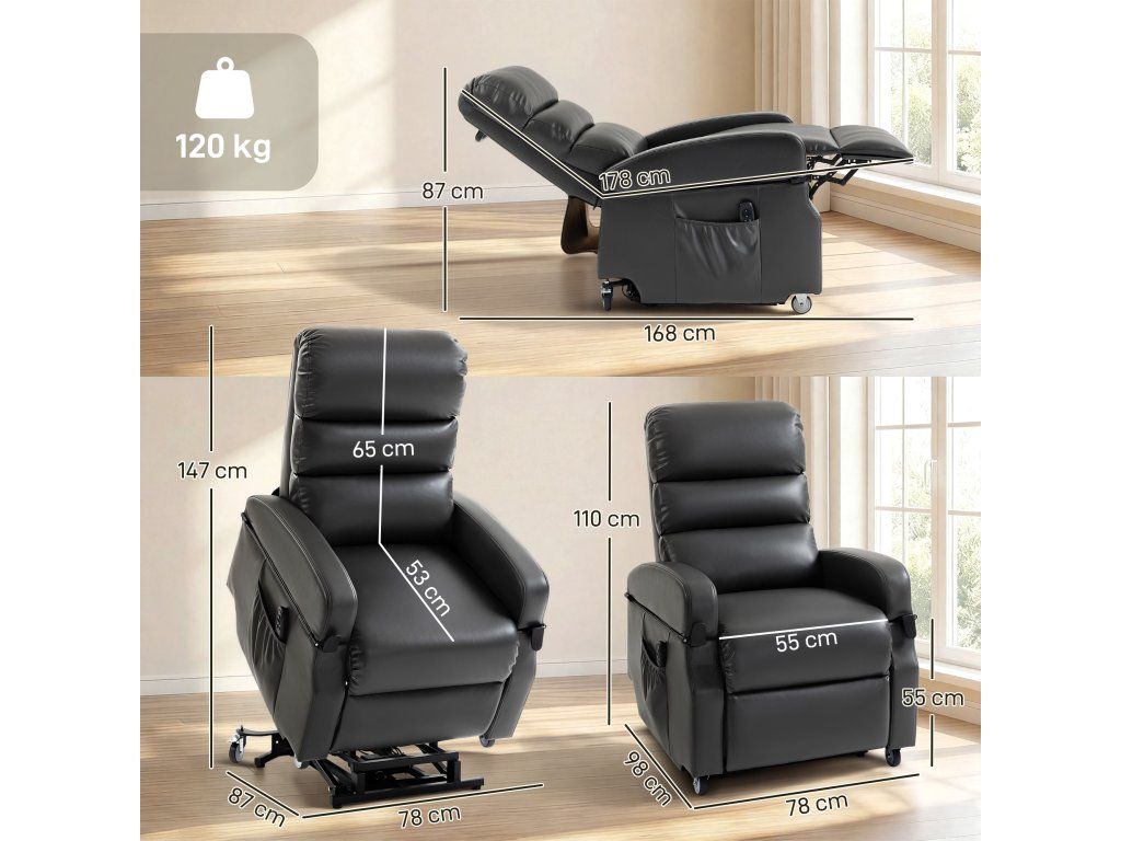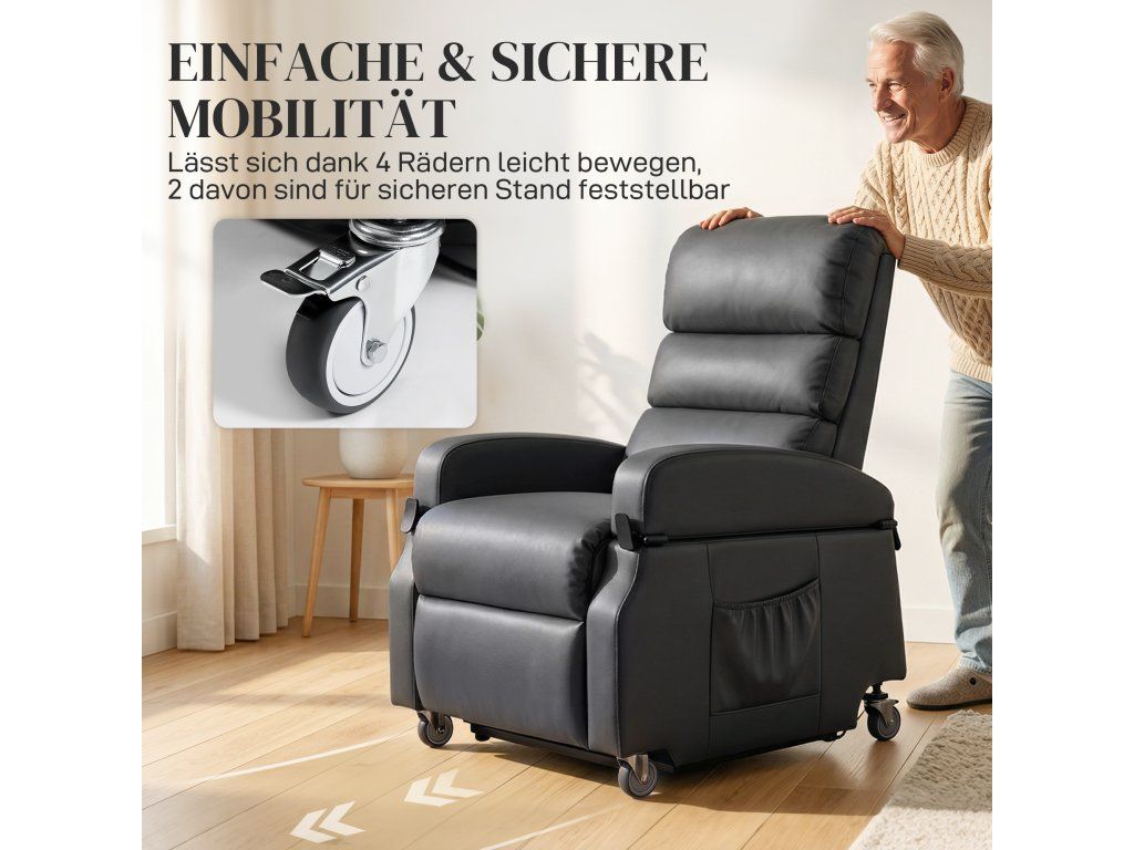 Polohovací křeslo HOMCOM kombinuje pohodlí a nezávislost. Díky funkci jemného zvedání usnadňuje a bezpečněji vstávání a chrání vaše kolena a záda. V plně sklopené poloze se zvedne vertikálně o 20 cm, což usnadňuje přesun a zachovává vaši důstojnost. Díky měkkému polstrování a čalounění z umělé kůže zajišťuje toto TV polohovací křeslo celodenní pohodlí bez stresu.