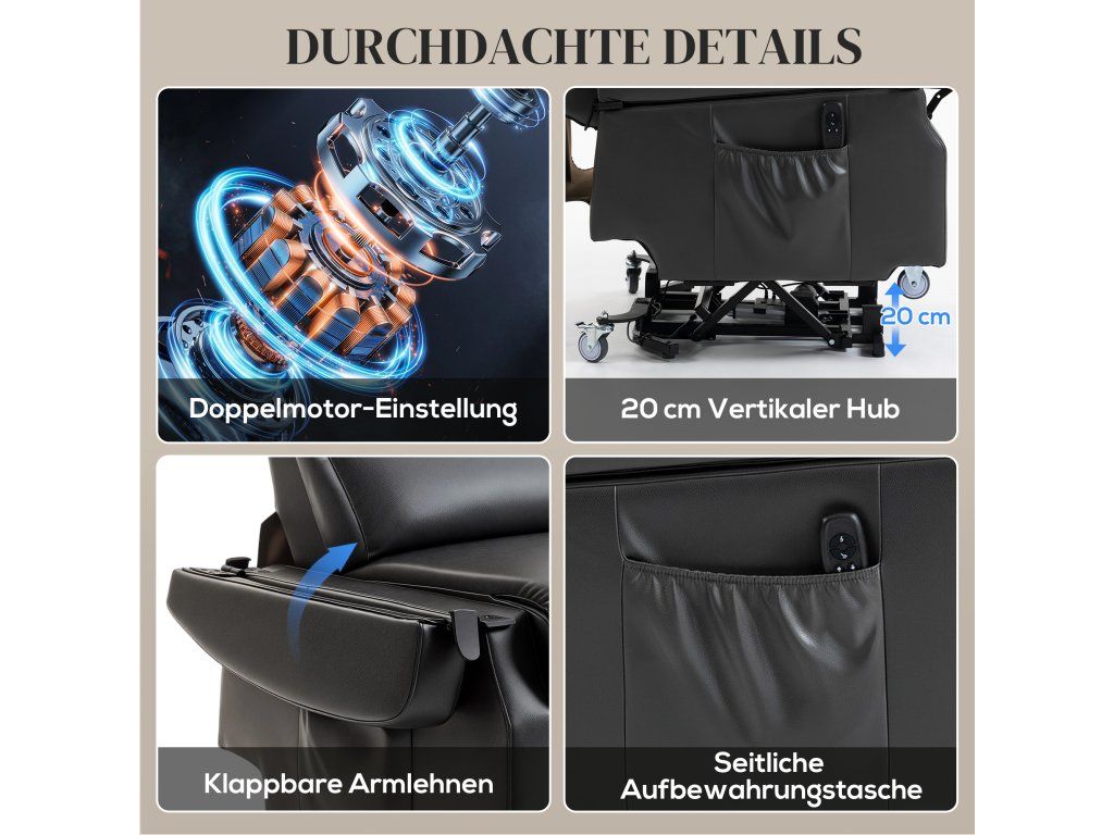Vertikální zdvih polohování a dva motory: S úhlem sklonu až 170° nabízí toto polohovací křeslo maximální pohodlí. V plném sklopení se zvedne vertikálně až o 20 cm, zatímco opěradlo lze zaaretovat v libovolném požadovaném úhlu. Obě loketní opěrky se dají sklopit pro snadný přístup a nezávislé dva motory umožňují individuální nastavení opěradla a opěrky nohou.