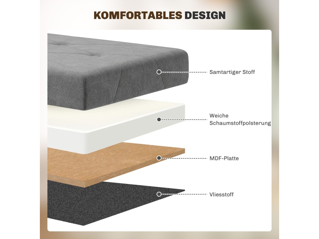 - Robustní konstrukce: Tato čalouněná lavice je vyrobena z pevného rámu z MDF a dubových nohou a unese až 120 kg