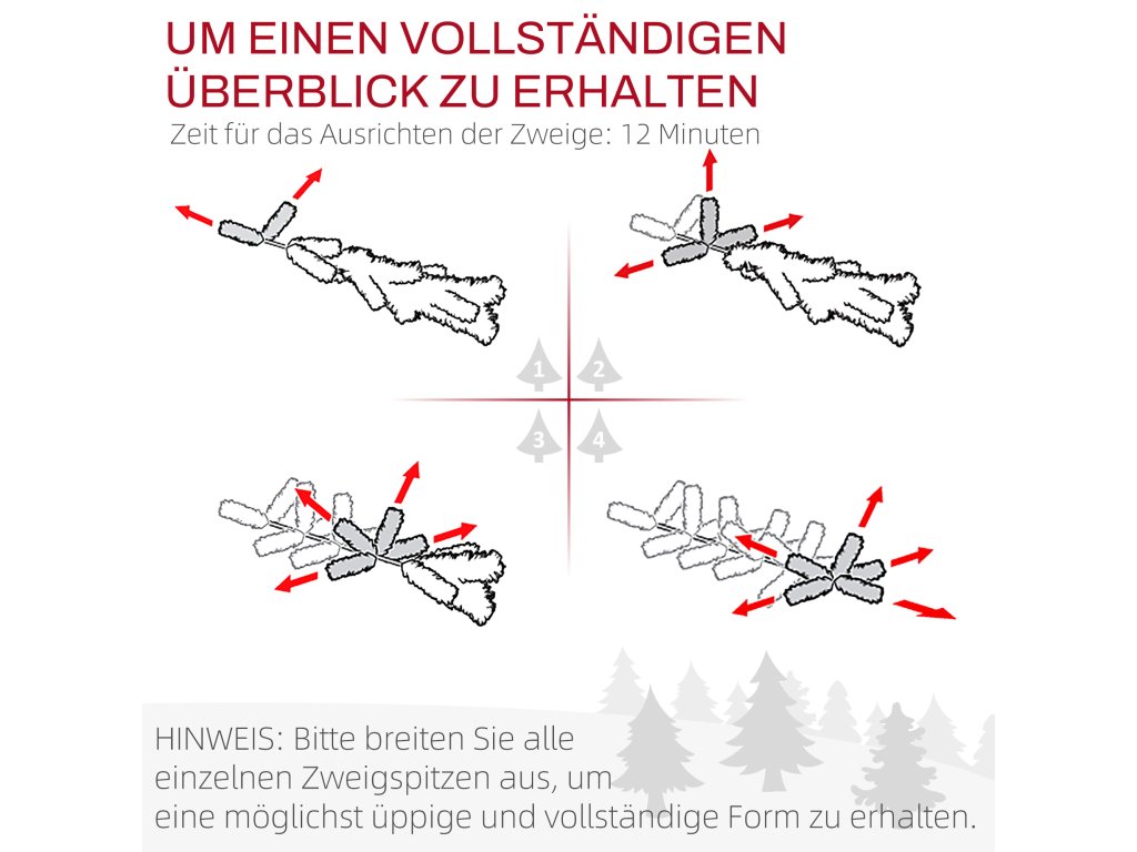 - Rychlá montáž: Díky praktickému designu pantů, který automaticky spouští větve do správné polohy, stejně jako předtvarovaným větvím, které lze snadno navrhnout, lze 180 cm vánoční stromek postavit za pouhých 12 minut.
