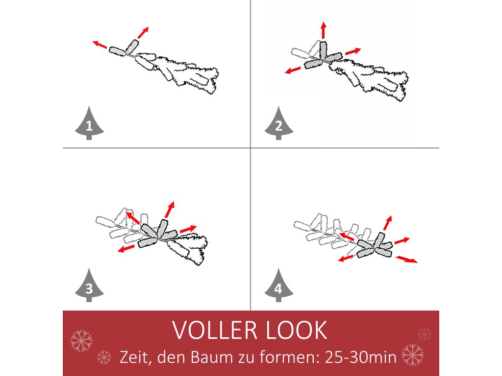 Celkové rozměry vánočního stromku: Ø90 x 180V cm. Pro obzvláště realistický vzhled rozložte každou špičku jednotlivě, což trvá přibližně 25–30 minut. Ozdoby nejsou součástí balení.