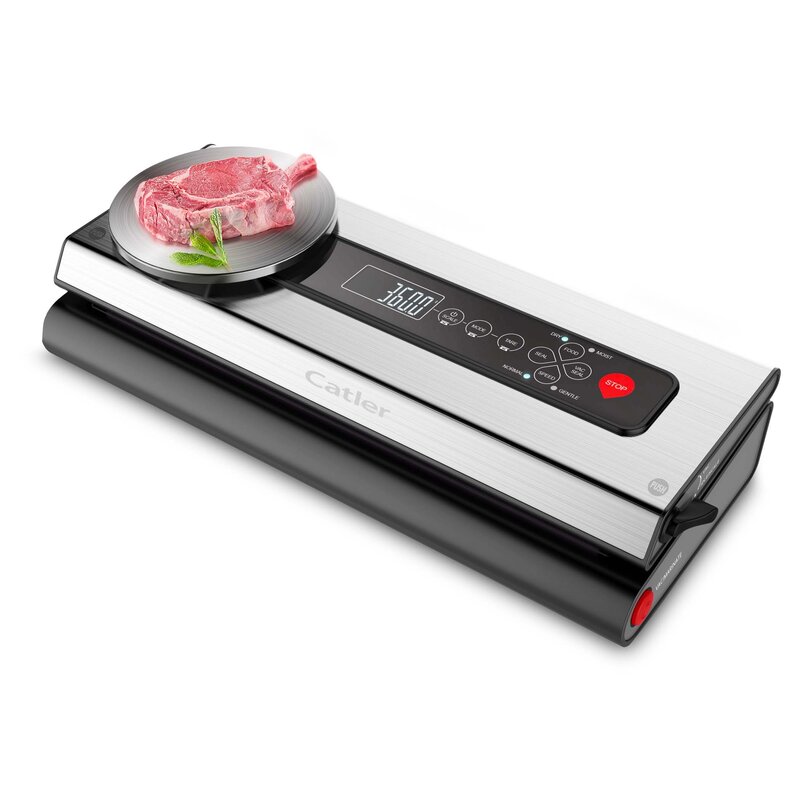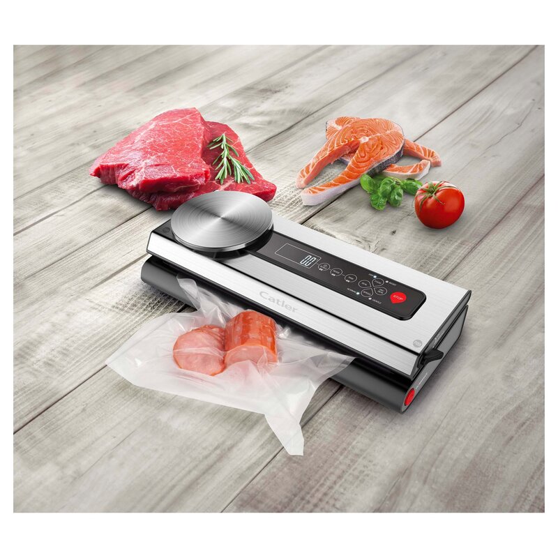 Abyste vše k přípravě potravin pro skladování měli po ruce, součástí vakuovačky je odnímatelná kuchyňská váha, kterou je možné napájet i bateriemi, a také řezací nůž. Při častém používání oceníte i úpravu proti otiskům prstů a lehce omyvatelný hladký povrch.