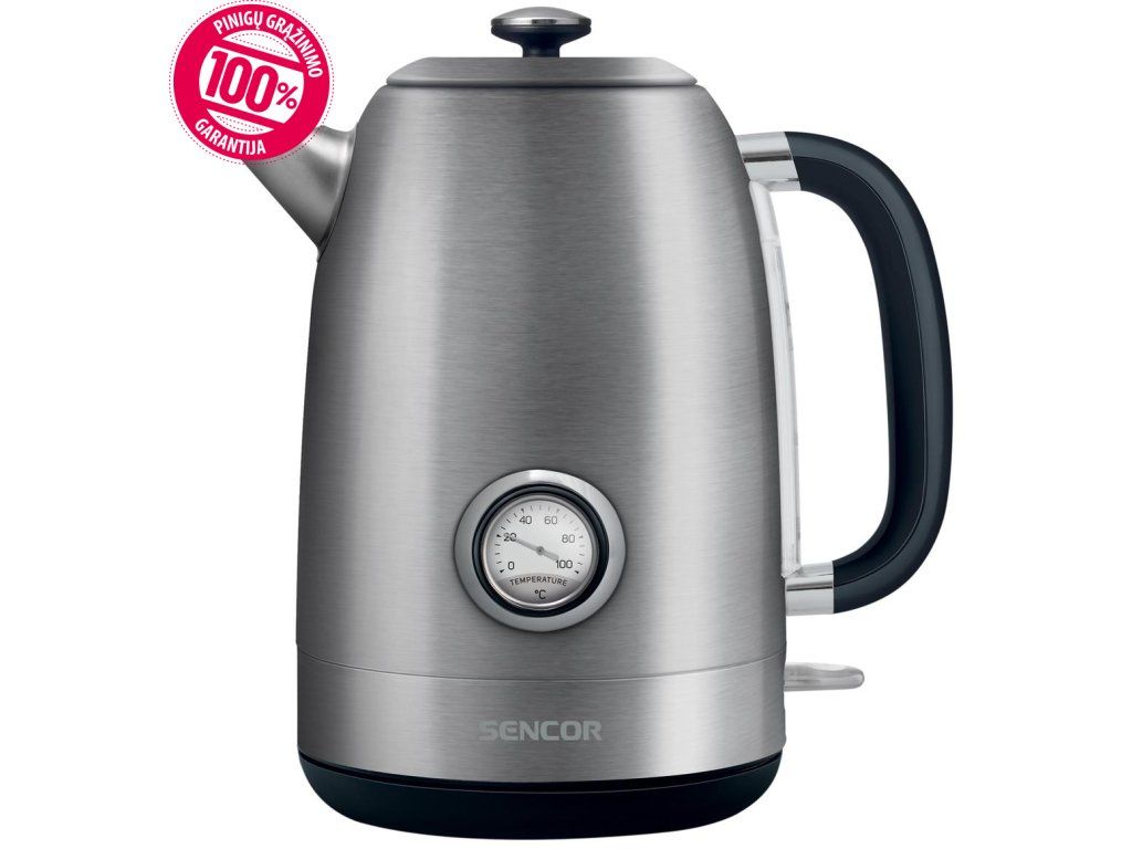 Nerezová rychlovarná konvice s ručičkovým teploměrem.
