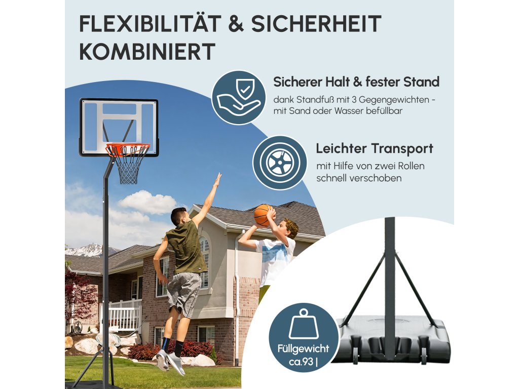 Stabilní základna: Základnu tohoto basketbalového koše lze naplnit až 50 kg vody nebo 85 kg písku, což zajišťuje stabilitu i pro ty nejaktivnější hráče. Na základně je také drážka pro umístění míče.