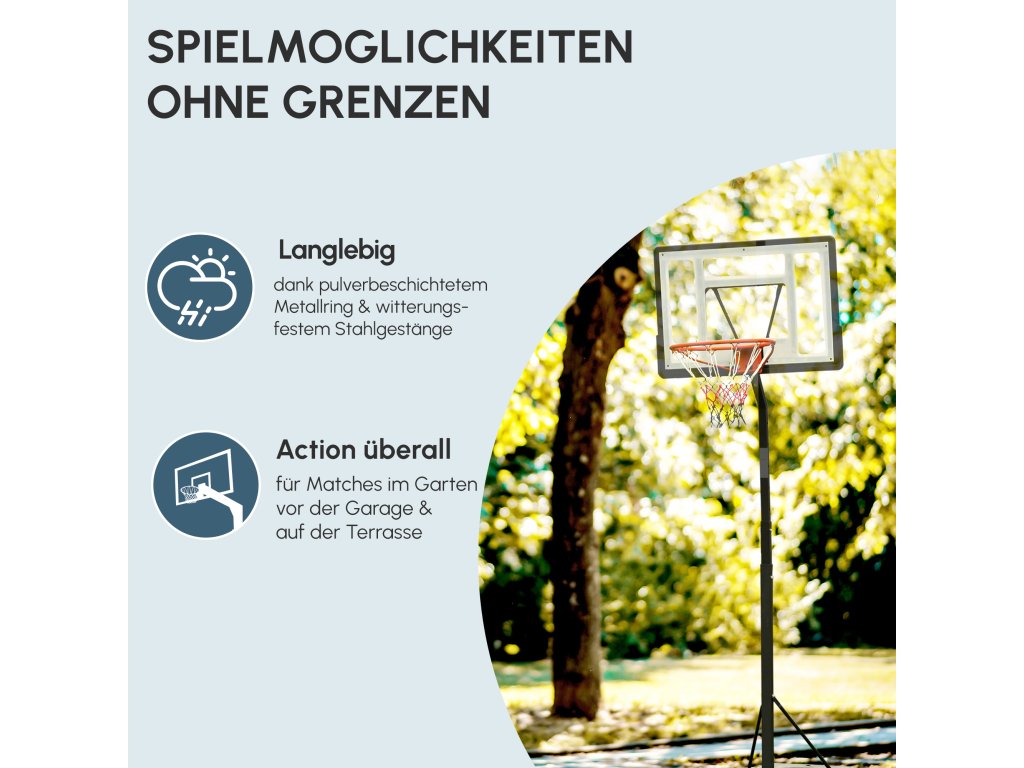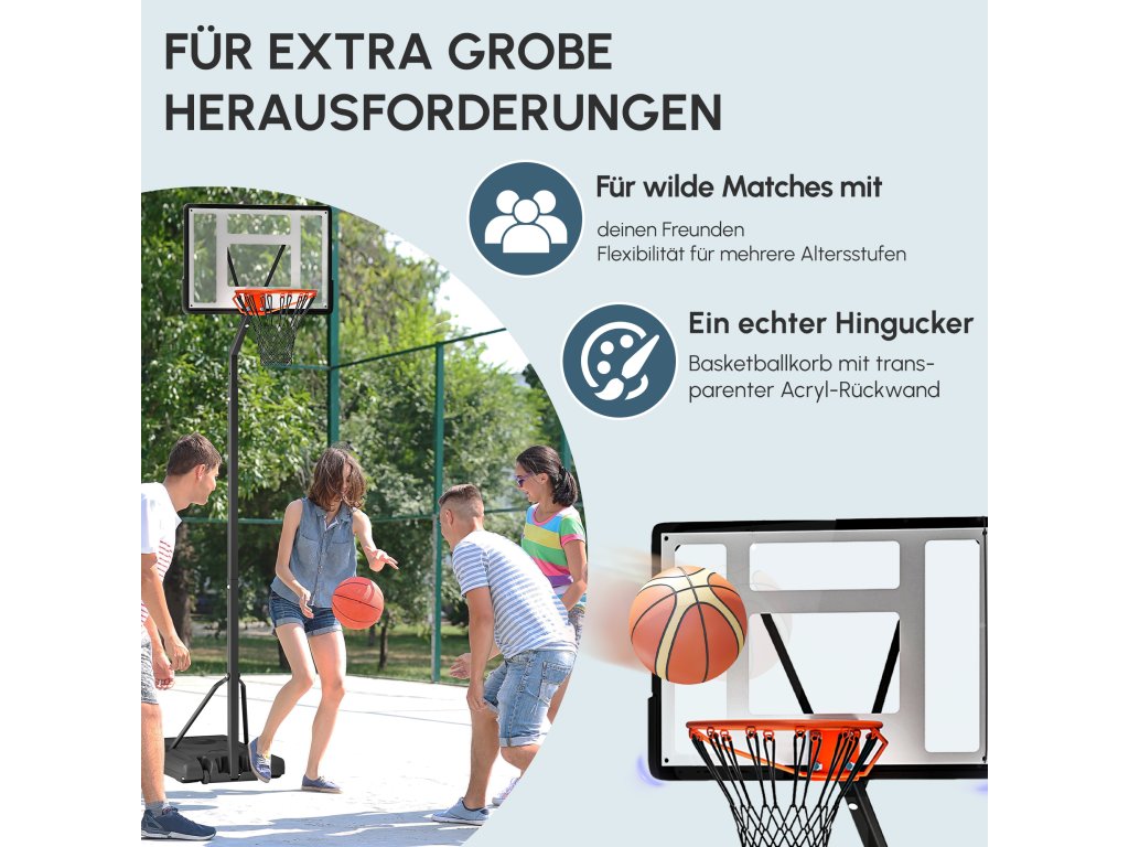Nastavitelná výška: Tento basketbalový stojan lze nastavit od 255 cm až 305 cm pro hráče různých výšek a potřeb. Ideální pro dospělé.