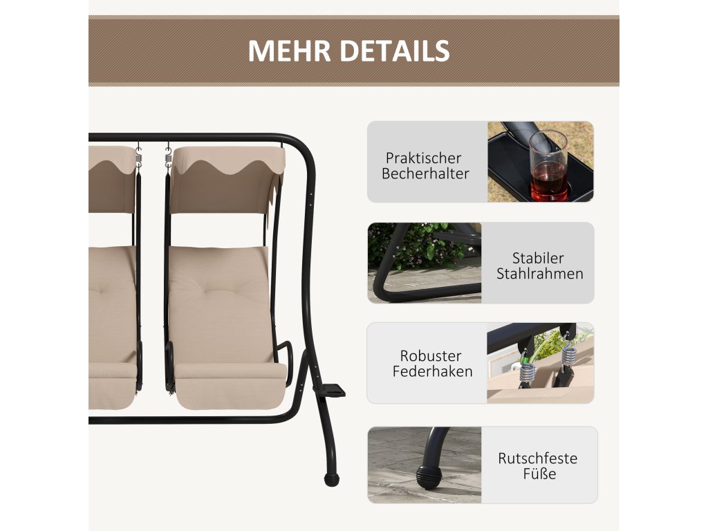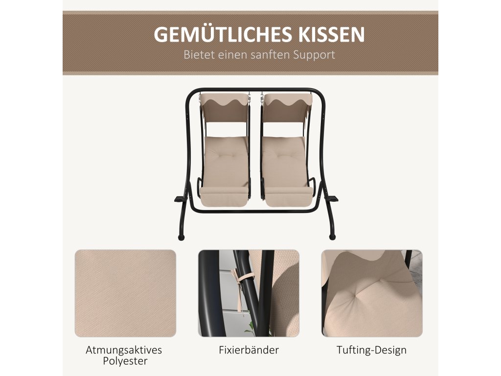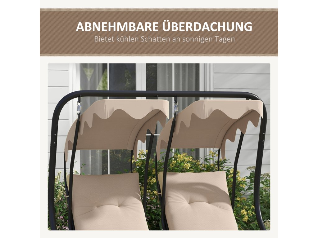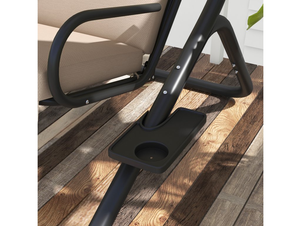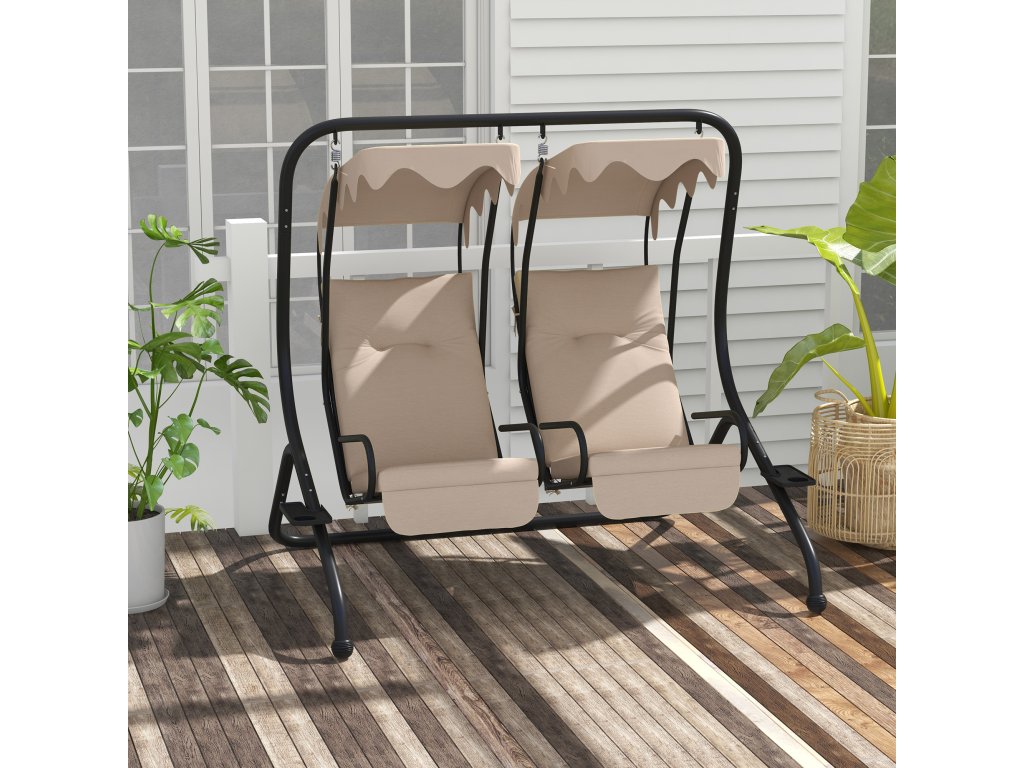 Venkovní houpačka Outsunny s držákem na pohár a podsedákem, 2místná zahradní houpačka se stříškou, nosnost houpací lavice do 220 kg, 170 x 136 x 170 cm, béžová