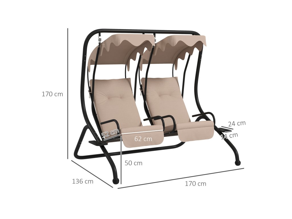 Údaje o produktu zahradní houpačky: Celkové rozměry: 170L x 136W x 170V cm, plocha sedáku 62W x 52Dcm, výška sedáku (bez polštáře) 50 cm, max. nosnost na jedno sedadlo 110 kg