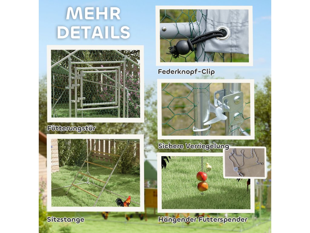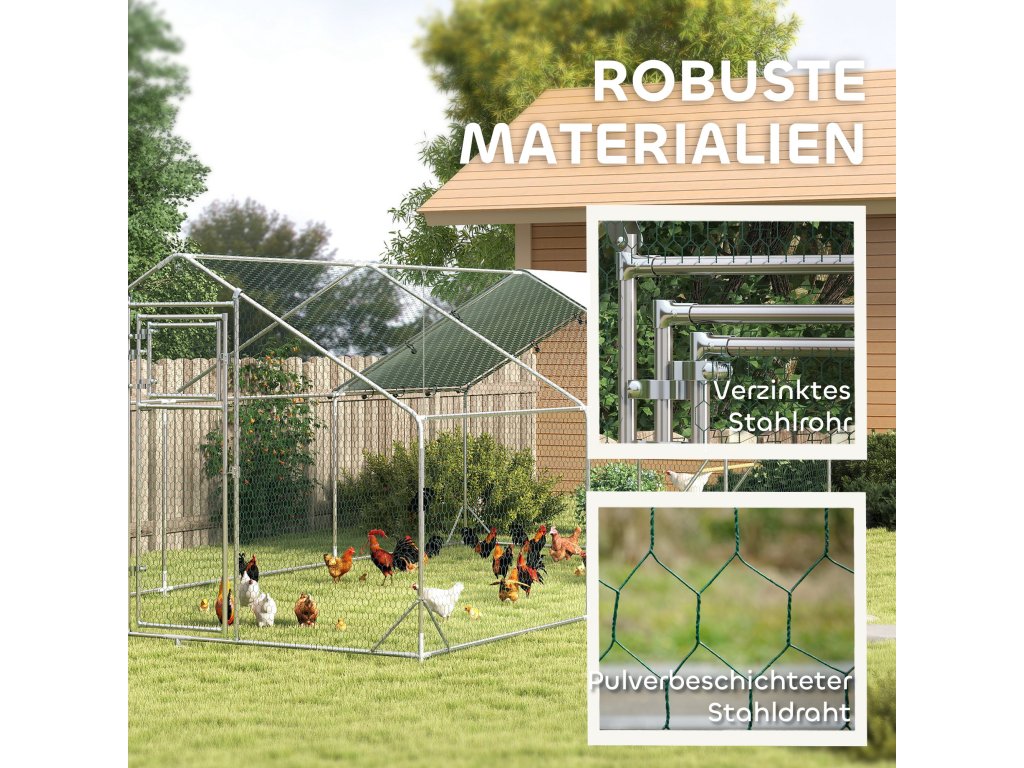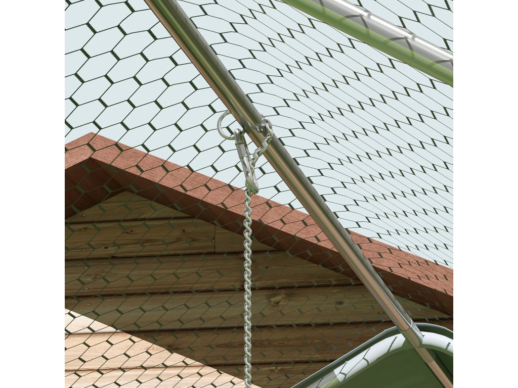 Robustní materiály: Jemné šestihranné pletivo, vyrobené z pozinkované oceli o tloušťce 2,5 cm a ocelového drátěného pletiva potaženého plastem, nabízí optimální venkovní ochranu a bezpečné prostředí pro vaše kuřata