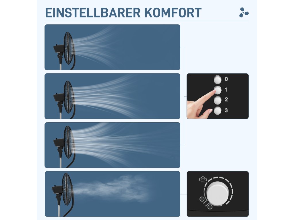 Široký dosah: Užijte si osvěžující vánek z jakéhokoli směru díky otočení o 75° a naklonění o 15°, které zajišťují široké a rovnoměrné rozložení chladného vzduchu a mlhy. Mobilitu zajišťují kolečka stojanu s funkcí mlhy.