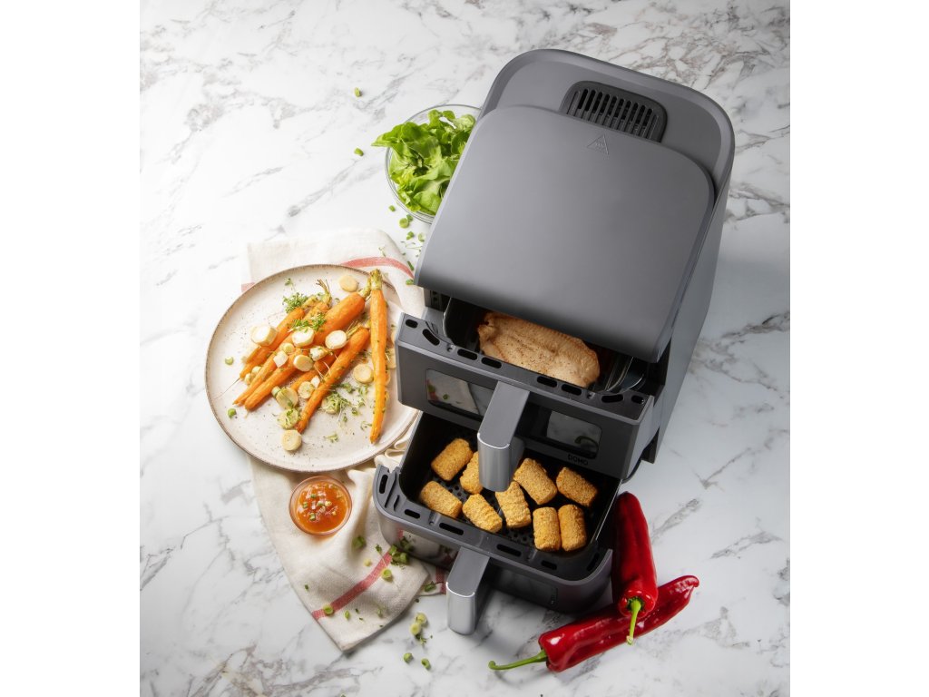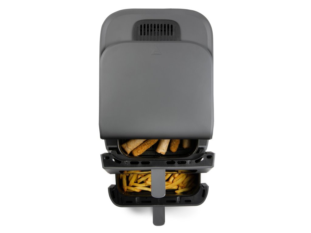Vertikální uspořádání dvou košů nad sebou (3,5 litru a 6,5 litru) je i efektivnější, neboť zbytkové teplo spodní zóny ohřívá zároveň zónu horní. Plně digitální ovládání s odděleným ovládáním teploty a času pro každou zónu zvlášť.