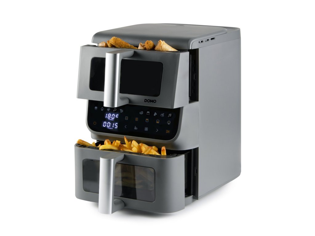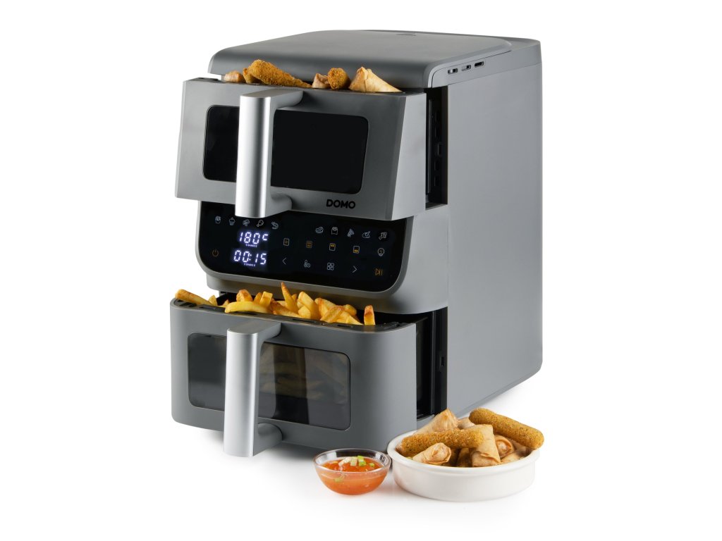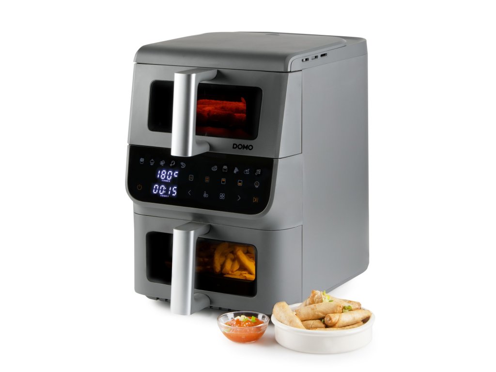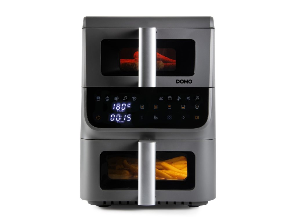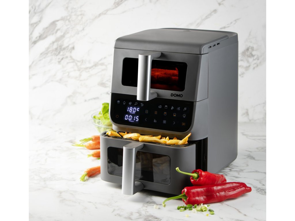 Vertikální dvojitá horkovzdušná fritéza 3,5+6,5 l - DOMO DO550FR, 2 500 W, 2 samostatné zóny, celková kapacita 10 litrů, s průzory