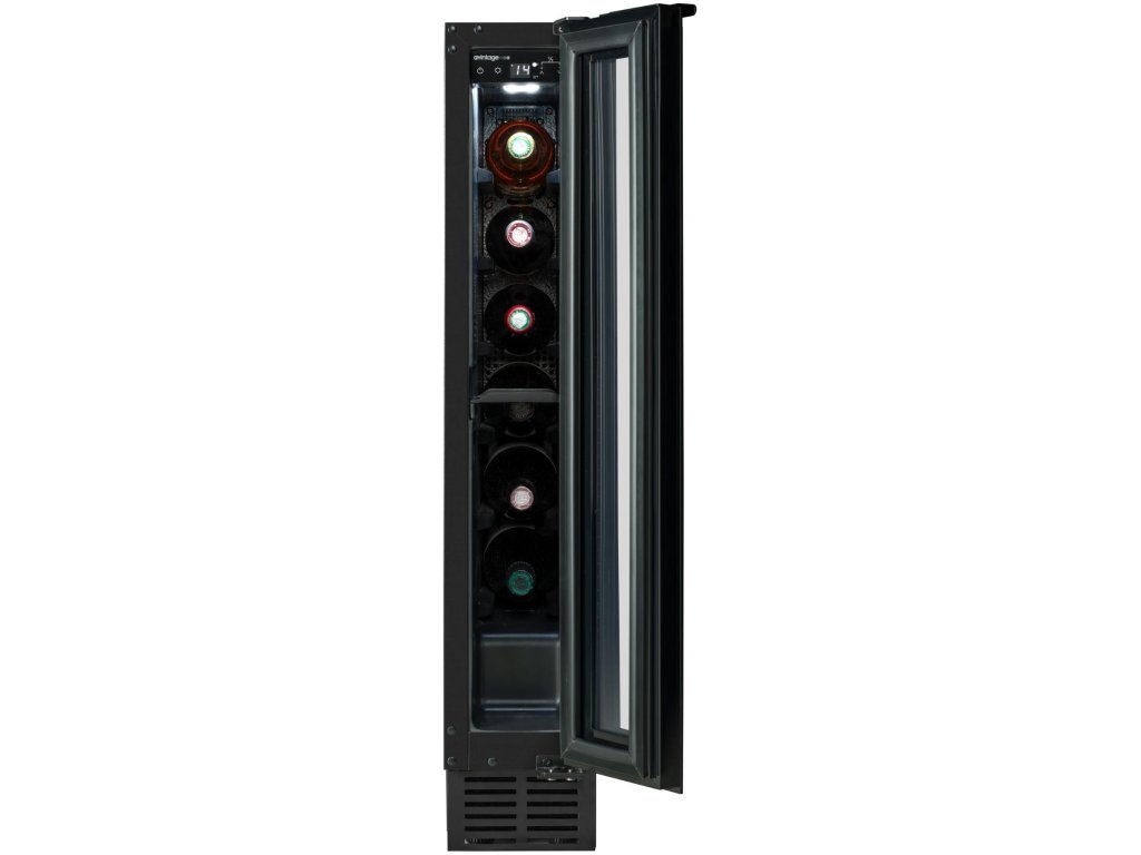 Jednozónová vinotéka značky Avintage s možností instalace jako volně stojící nebo vestavěná pod pracovní deskou; Možnost demontáže spodní ventilační mřížky a jejího nahrazení nábytkovým soklem; Kapacita 8 lahví; Rozsah nastavení teplot 5-20 °C; Prosklené dveře s černým rámem a madlem, 3 vrstvy tvrzeného, šedo-černě tónovaného skla s UV filtrem; Možnost změny směru otevírání dveří; Bílé LED osvětlení s vypínačem; 4 výškově stavitelné nožky; 6 ks pevných kovových polic; Elektronická regulace teploty; Dotykové ovládání s displejem v bílé barvě; Systém aktivní ventilace; Antivibrační systém; Zvukový a vizuální signál zvýšení teploty; Energetická třída F; Klimatická třída SN-ST; Roční spotřeba energie: 97 kWh; Použitelná při okolní teplotě 10-38 °C; Hlučnost 37 dB; Hmotnost 19,5 kg; Rozměry (VxŠxH): 82 x 14,5 x 54 cm.