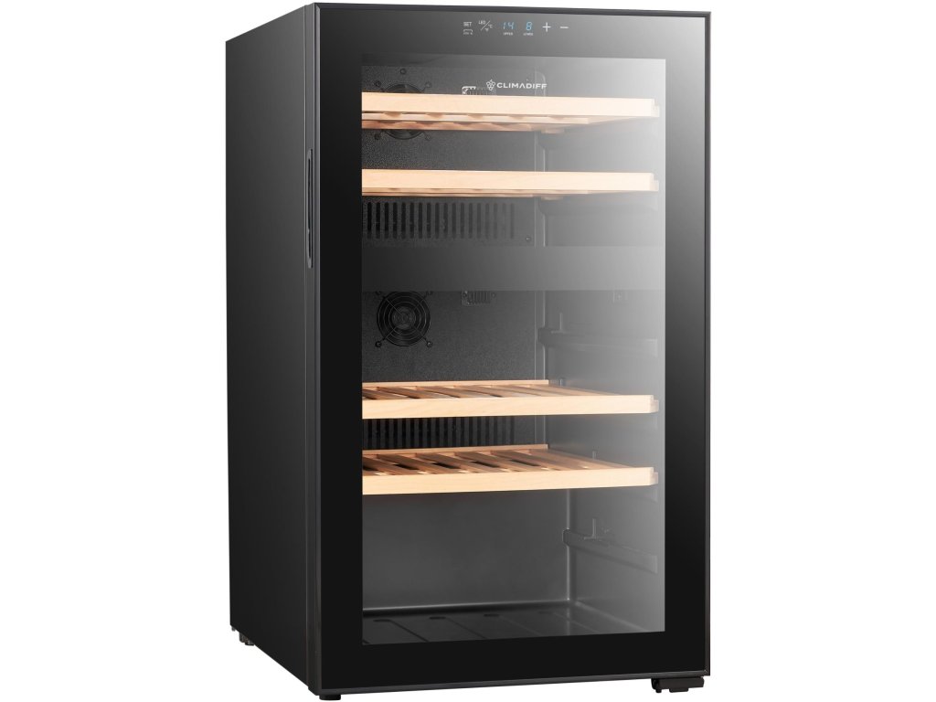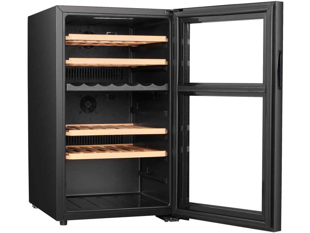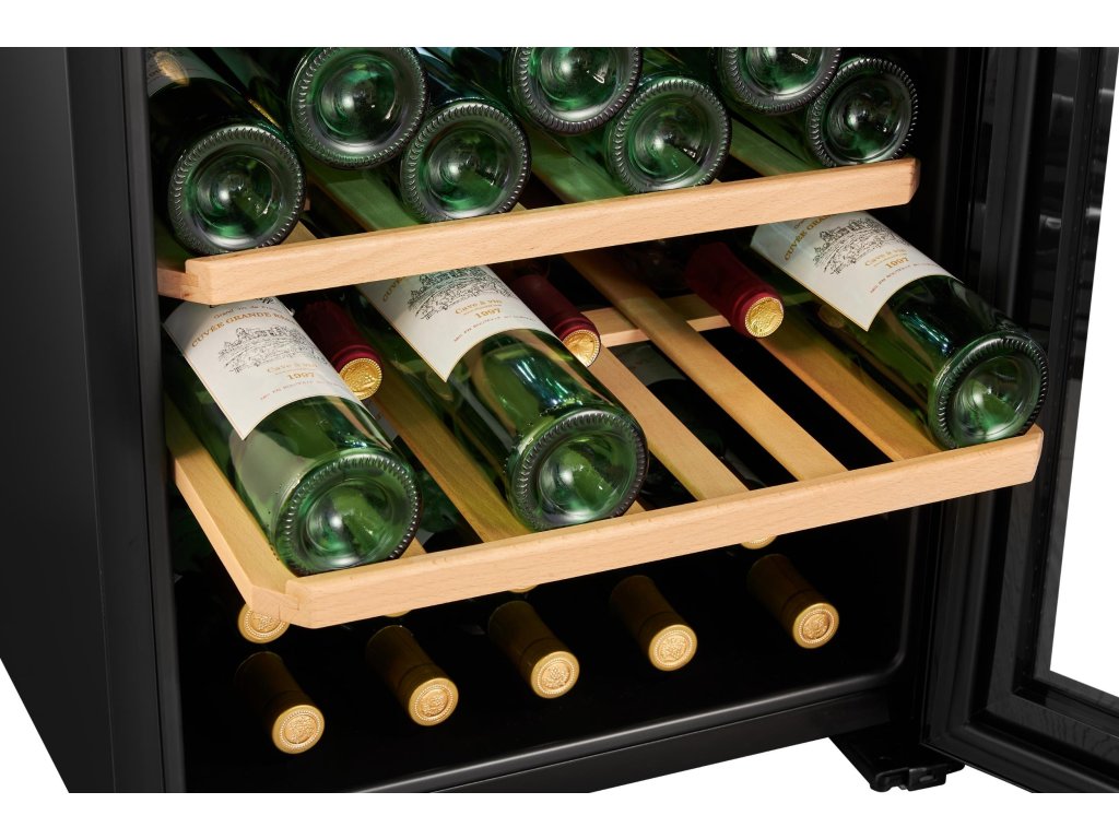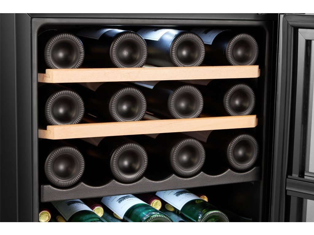 Volně stojící dvouzónová servírovací vinotéka se 2 nezávislými chladícími zónami; Celková kapacita 52 lahví o objemu 75 cl (horní zóna 21 lahví, spodní zóna 31 lahví); Rozsah nastavení teplot: 5~20 °C pro horní zónu a 5~20 °C pro spodní zónu; Skleněné dveře s černým rámem a zapuštěným madlem; 3 vrstvy tvrzeného skla s černým tónováním a UV filtrem; Černé tělo vinotéky; Elektronická regulace teploty; Dotykové ovládání s LED displejem v bílé barvě; Bílé LED osvětlení s vypínačem; Automatické odmrazování; Systém aktivní ventilace v obou zónách; Antivibrační systém; Zvukový a vizuální signál zvýšení teploty; 4 dřevěné police; 4 výškově nastavitelné nožičky; Délka napájecího kabelu 200 cm; Energetická třída F; Klimatická třída N; Roční spotřeba energie: 105 kWh; Hlučnost 37 dB(A); Hmotnost 38 kg; Rozměry (VxŠxH): 83,5 x 49,5 x 59,6 cm.