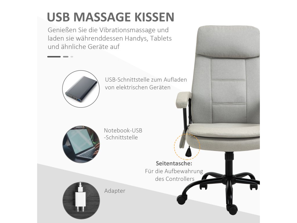 Tato kancelářská židle s masážní funkcí od společnosti Vinsetto vám osladí pracovní den. Vestavěná masážní funkce masíruje vaše dolní část zad. Měkké čalounění a svrchní materiál z prodyšné tkané látky poskytují dostatek pohodlí při dlouhém sezení. Díky otočným kolečkům se herní židle snadno přemisťuje. Vestavěná funkce houpání zajišťuje příjemné přestávky. Toto masážní křeslo od společnosti Vinsetto slibuje dostatek útulnosti během dlouhých pracovních dnů.