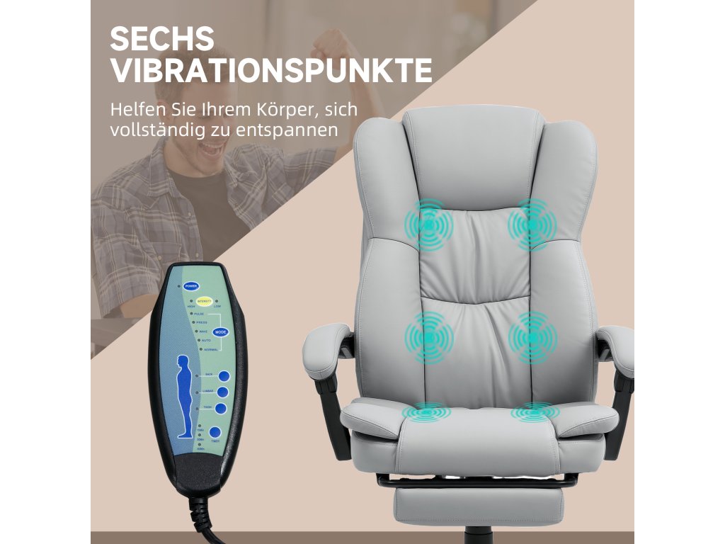 Zajistěte si pohodlí během pracovního dne v kanceláři s touto ergonomickou kancelářskou židlí s podnožkou od společnosti Vinsetto. Díky funkci otáčení o 360 stupňů lze tuto polohovatelnou kancelářskou židli otáčet v libovolném směru. K dispozici je 6 vibračních bodů a 5 masážních režimů, které uvolní vaše tělo, a ovládá se pomocí dálkového ovladače. Otočné křeslo je výškově nastavitelné a opěradlo lze naklápět. Pohodlnou opěrku nohou lze také sklopit a vyklopit.
