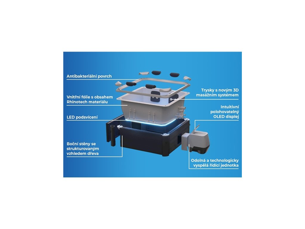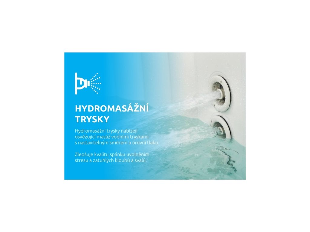 - Trysky: 120 vzduchových + 8 nastavitelných hydromasážních trysek