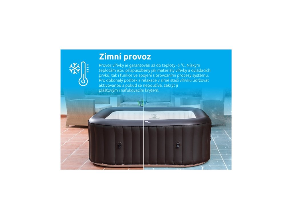 - Provoz vířivky je garantován až do teploty -5 °C. Nízkým teplotám jsou přizpůsobeny jak materiály vířivky a ovládacích prvků, tak i funkce ve spojení s provozními procesy systému. Pro dokonalý požitek z relaxace v zimě stačí vířivku udržovat aktivovanou a pokud se nepoužívá, zakrýt ji plášťovým i nafukovacím krytem. Při poklesu venkovní teploty pod 0 °C je před nafouknutím potřeba nechat plášť vířivky aklimatizovat v teplé místnosti po dobu 24 hodin. Po vynesení vířivky ven, je nutné ji ihned nafouknout, napustit vodou a zapnout ohřev. Ve velkém mrazu nedoporučujeme dlouhodobé používání vířivky venku.
