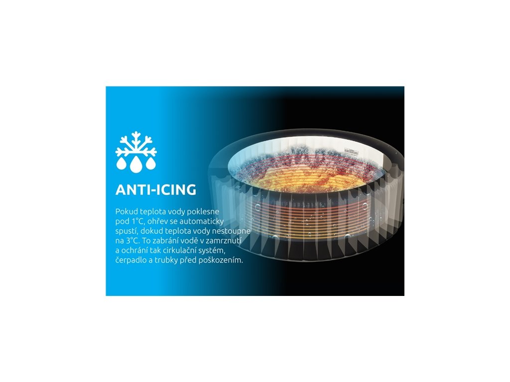 - Úplně nový systém ANTI-ICING bude neustále dohlížet na vaši vířivou vanu a hlídat bezpečnou úroveň teploty. Pokud teplota vody poklesne pod 1°C, ohřev se automaticky spustí, dokud teplota vody nestoupne na 3°C. Toto zabrání vodě v zamrznutí a ochrání tak cirkulační systém, čerpadlo a trubky před poškozením. Při poklesu teploty venku pod 4°C je nutné před nafouknutím nechat plášť vířivky aklimatizovat v teplé místnosti po dobu 24 hod. Po nafouknutí je nutné ji ihned napustit vodou a zapnout ohřev.