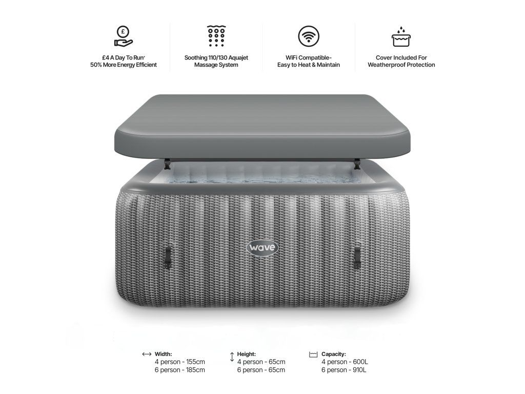 Na první pohled vás zaujme čtvercový tvar, který není jen designovým prvkem, ale především praktickým řešením. Oproti klasickým kulatým vířivkám umožňuje efektivně využít prostor – perfektně zapadne do rohů terasy nebo zahrady a eliminuje nevyužité „mrtvé zóny“. Díky větším rozměrům navíc nabízí dostatek místa až pro 6 osob.