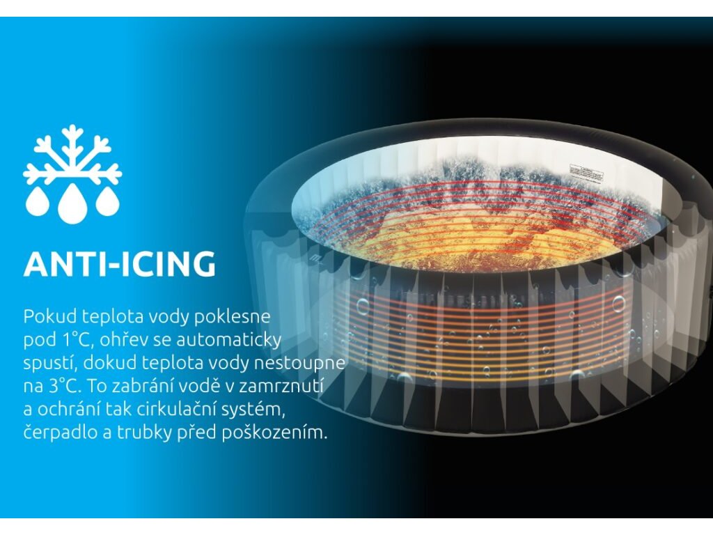 Úplně nový systém ANTI-ICING bude neustále dohlížet na vaši vířivou vanu a hlídat bezpečnou úroveň teploty. Pokud teplota vody poklesne pod 1°C, ohřev se automaticky spustí, dokud teplota vody nestoupne na 3°C. Toto zabrání vodě v zamrznutí a ochrání tak cirkulační systém, čerpadlo a trubky před poškozením. Při poklesu teploty venku pod 4°C je nutné před nafouknutím nechat plášť vířivky aklimatizovat v teplé místnosti po dobu 24 hod. Po nafouknutí je nutné ji ihned napustit vodou a zapnout ohřev.