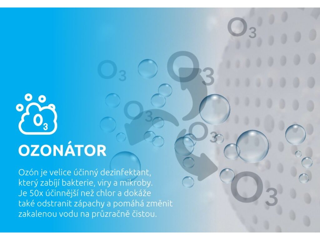 Jednoduše zapněte ozonový generátor stisknutím tlačítka Ozone na ovládacím panelu před použitím vířivky nebo po něm. Udržíte tak svou vířivou vanu a sebe během relaxace v perfektním stavu. Ozón je velice účinný dezinfektant, který zabíjí bakterie, viry a mikroby. Je 50x účinnější než chlor a dokáže také odstranit zápachy a pomáhá změnit zakalenou vodu na průzračně čistou.
