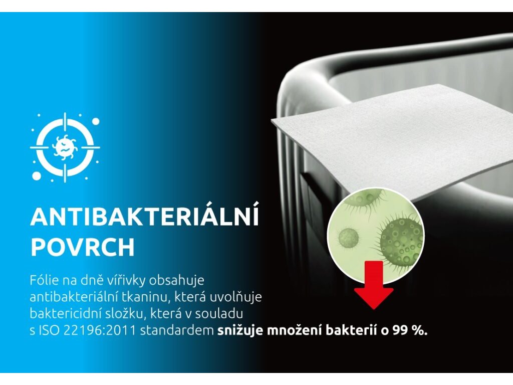 Vnitřní folie vířivé vany obsahuje antibakteriální tkaninu, která uvolňuje baktericidní složku, která v souladu s ISO 22196:2011 standardem snižuje množení bakterií o 99%.