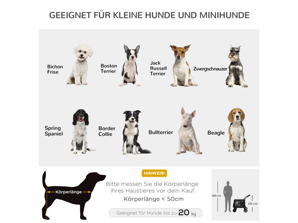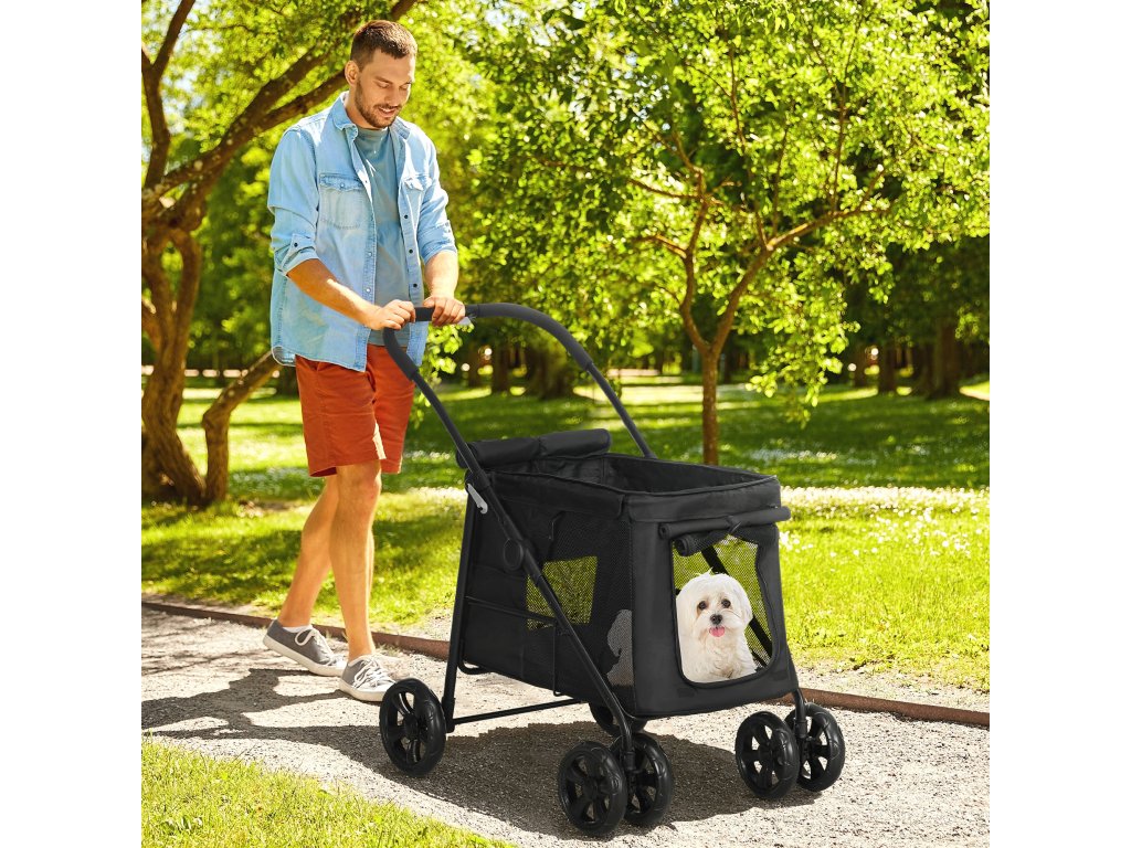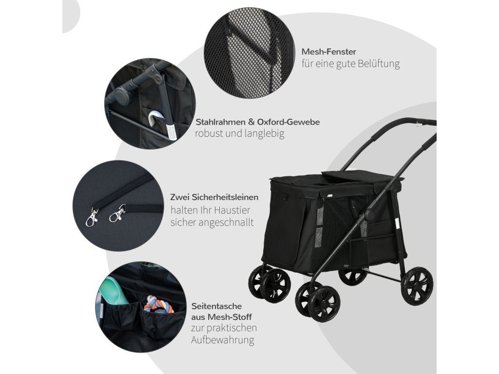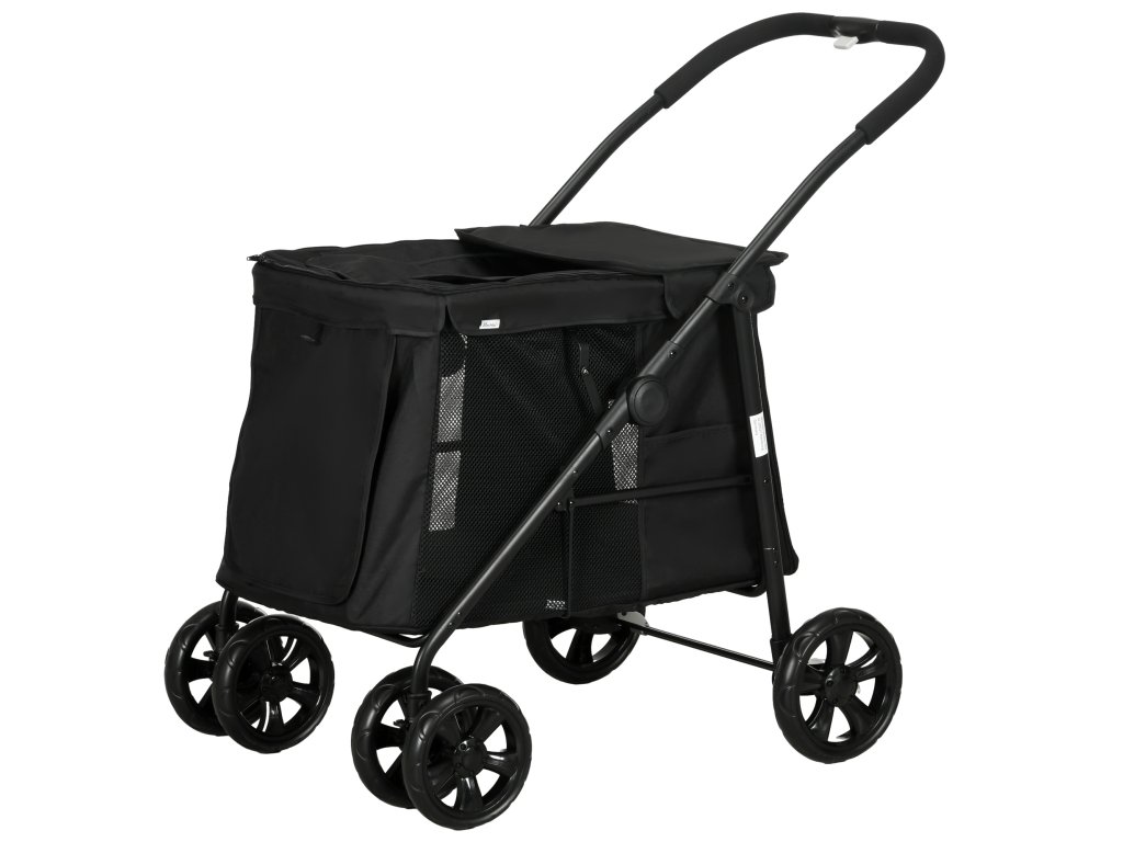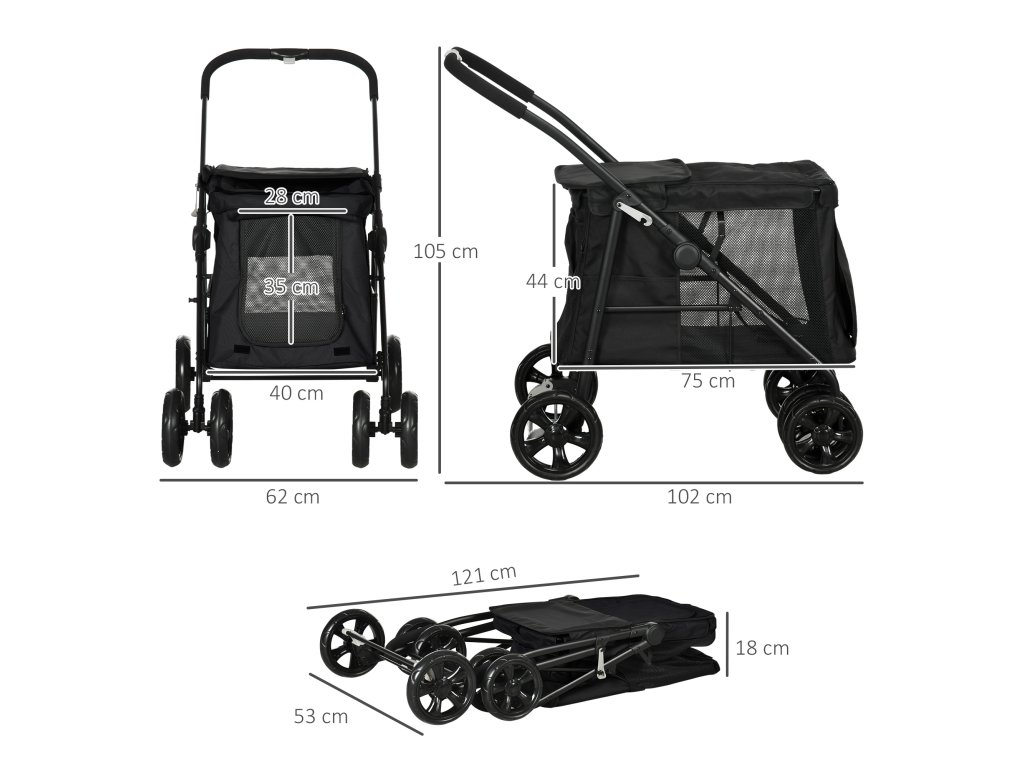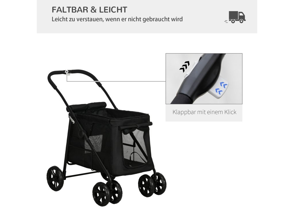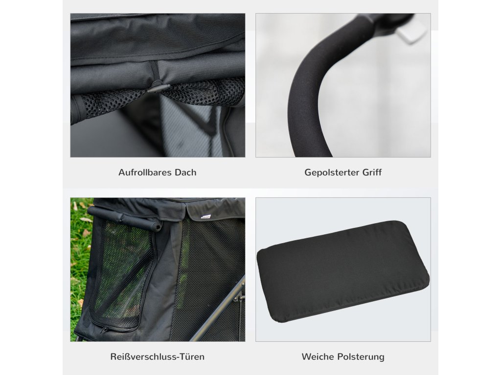 S kočárkem pro psy PawHut můžete bezpečně vzít svého mazlíčka ven. Složí se jedním kliknutím a snadno se přenáší. Čtyři kolečka a madlo usnadňují pohyb na silnici. Vozík pro psy je prostorný, takže váš chlupatý kamarád má uvnitř dostatek prostoru, síťovaná okna a dveře umožňují dostatek vzduchu dovnitř i ven. Látkový potah lze srolovat pro lepší ventilaci.