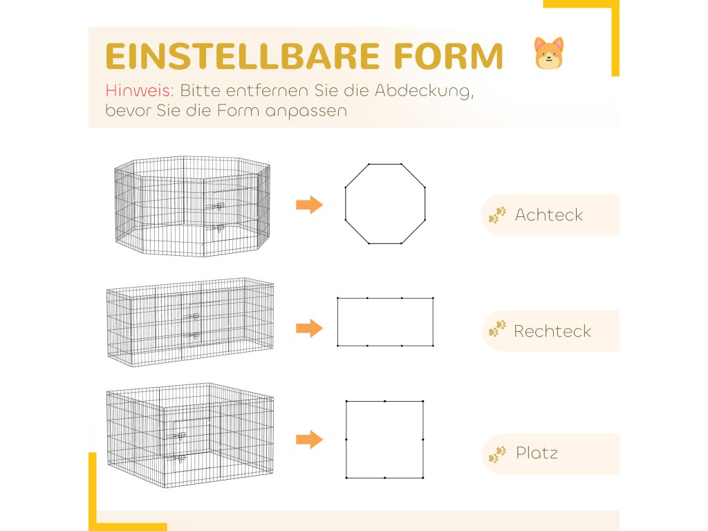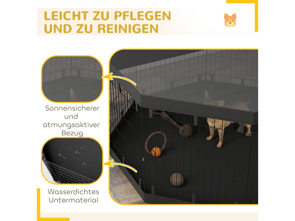 - Všestranné možnosti provedení: Tento výběh pro štěňata se skládá z osmi přizpůsobitelných panelů ze síťoviny a umožňuje různé možnosti uspořádání a snadné odstranění podlahové a stropní plachty