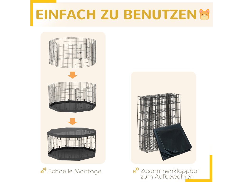 - Snadná montáž: Tento výběh pro štěňata je navržen pro jednoduchou montáž a lze jej snadno složit pro úsporu místa při skladování nebo přepravě