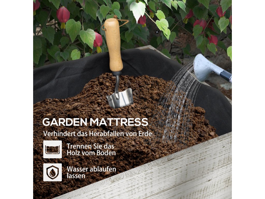 - Fleecová podšívka: Vložka z rouna zabraňuje prosakování zeminy a umožňuje volný odtok vody. Podložka odděluje půdu v květináči od dřevěné podlahy a pomáhá udržovat zeleninový záhon ve výborném stavu