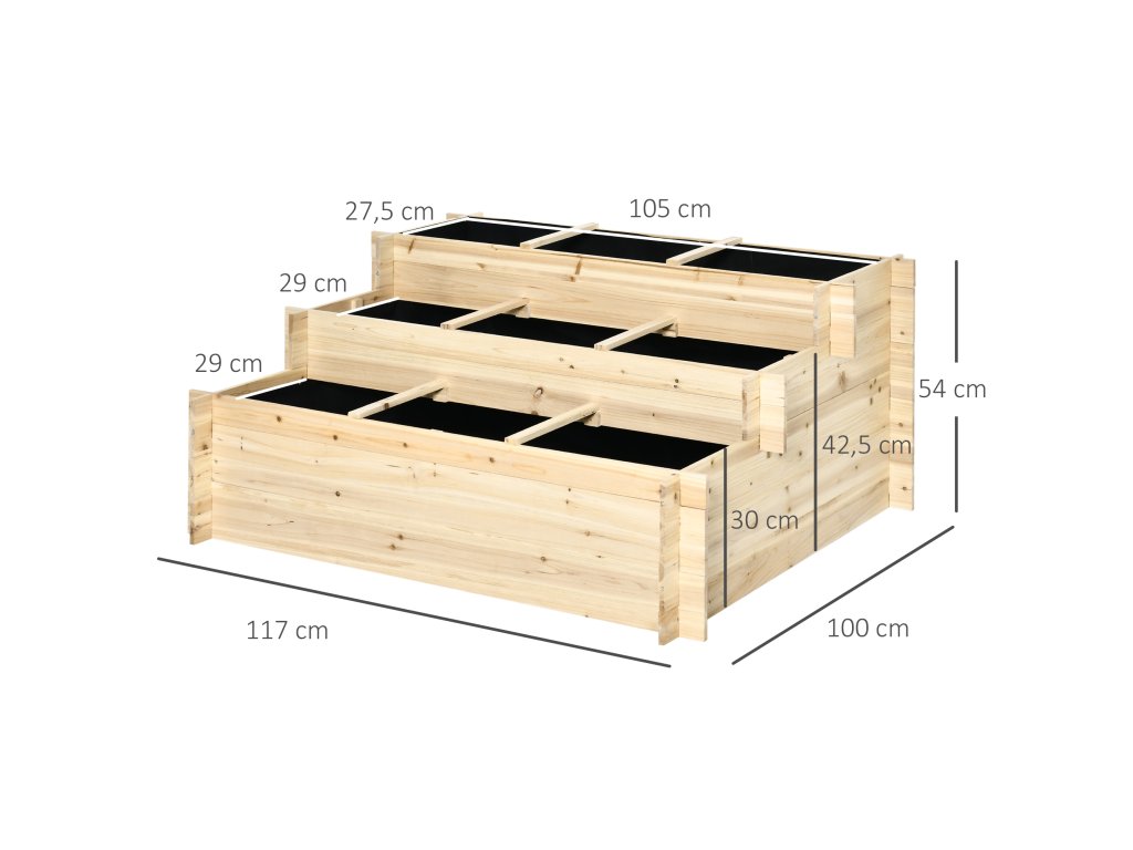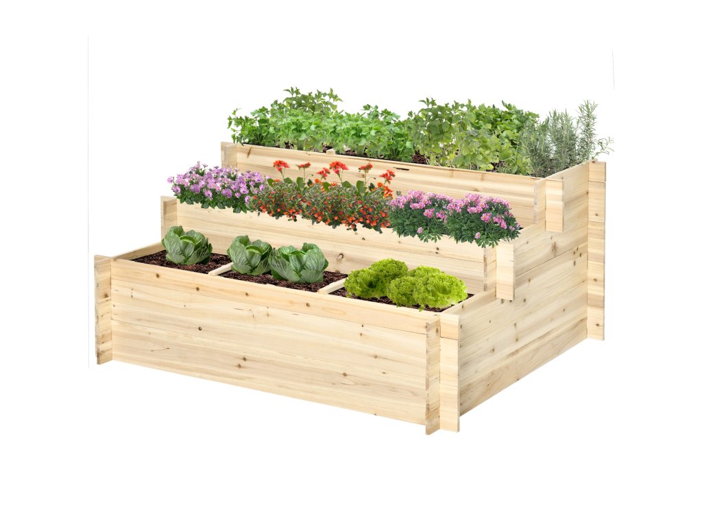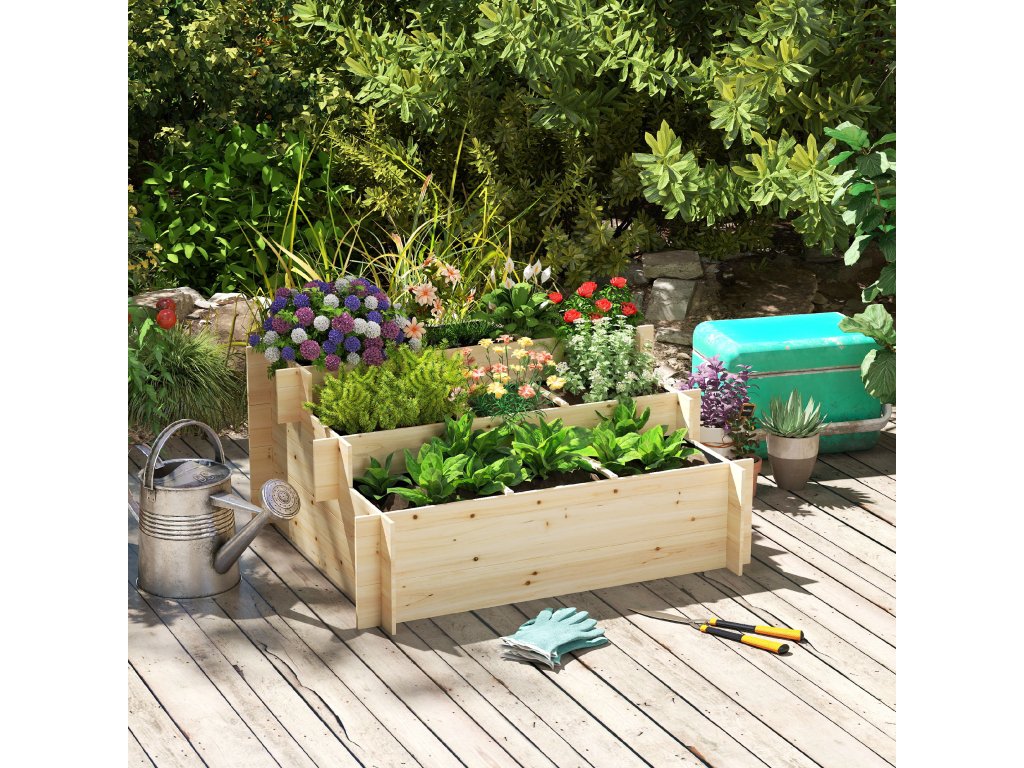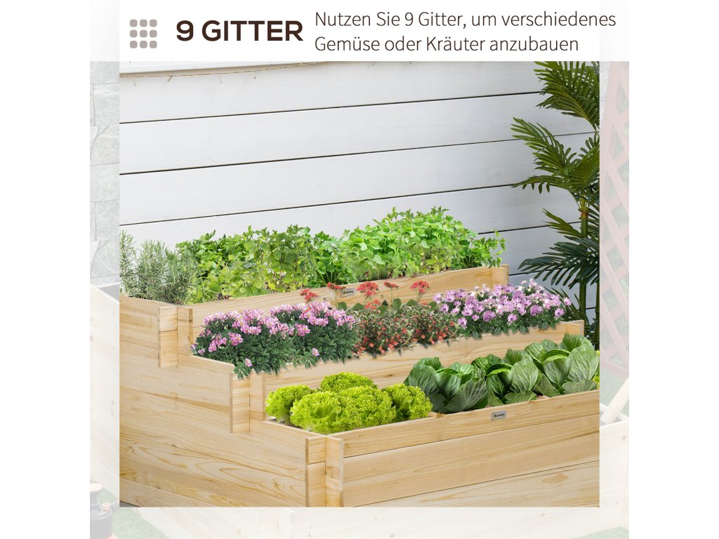Oživte svůj prostor vyvýšeným záhonem od společnosti Outsunny! Promyšlená konstrukce se 3 úrovněmi a 9 přihrádkami vytváří nejen dostatek prostoru, ale také dokonalé zóny pro rostliny s různými růstovými cykly. Tento vyvýšený záhon, vyrobený ze 100% přírodního jedlového dřeva, slibuje nejen stabilitu, ale také dlouhotrvající eleganci. Díky svému jednoduchému a rustikálnímu kouzlu se tento vyvýšený záhon skvěle hodí do každé zahrady, na balkon, terasu nebo dvůr!