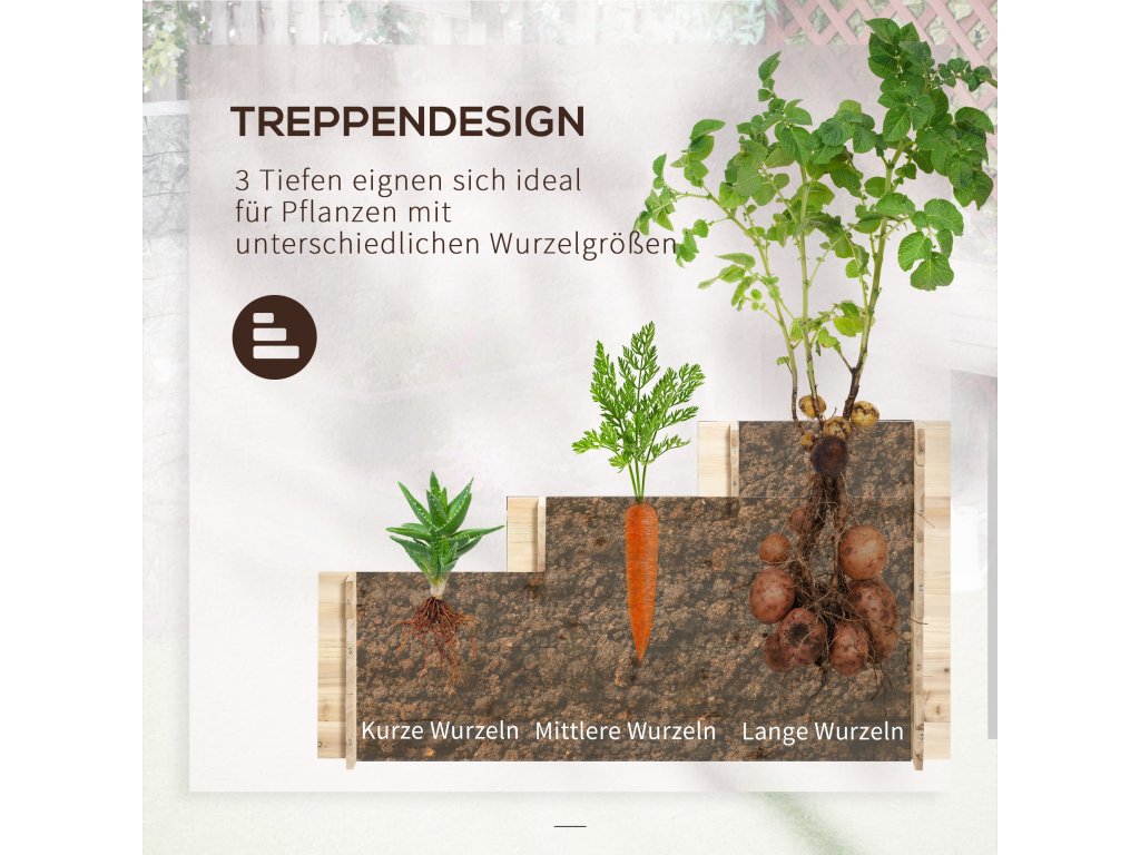 - Schodišťový design: Důmyslné uspořádání ve třech různých výškách činí z našeho vyvýšeného záhonu ideální domov pro rostliny s libovolnou délkou a velikostí kořenů. Jedinečné a praktické, od malých po velké, od krátkých po dlouhé