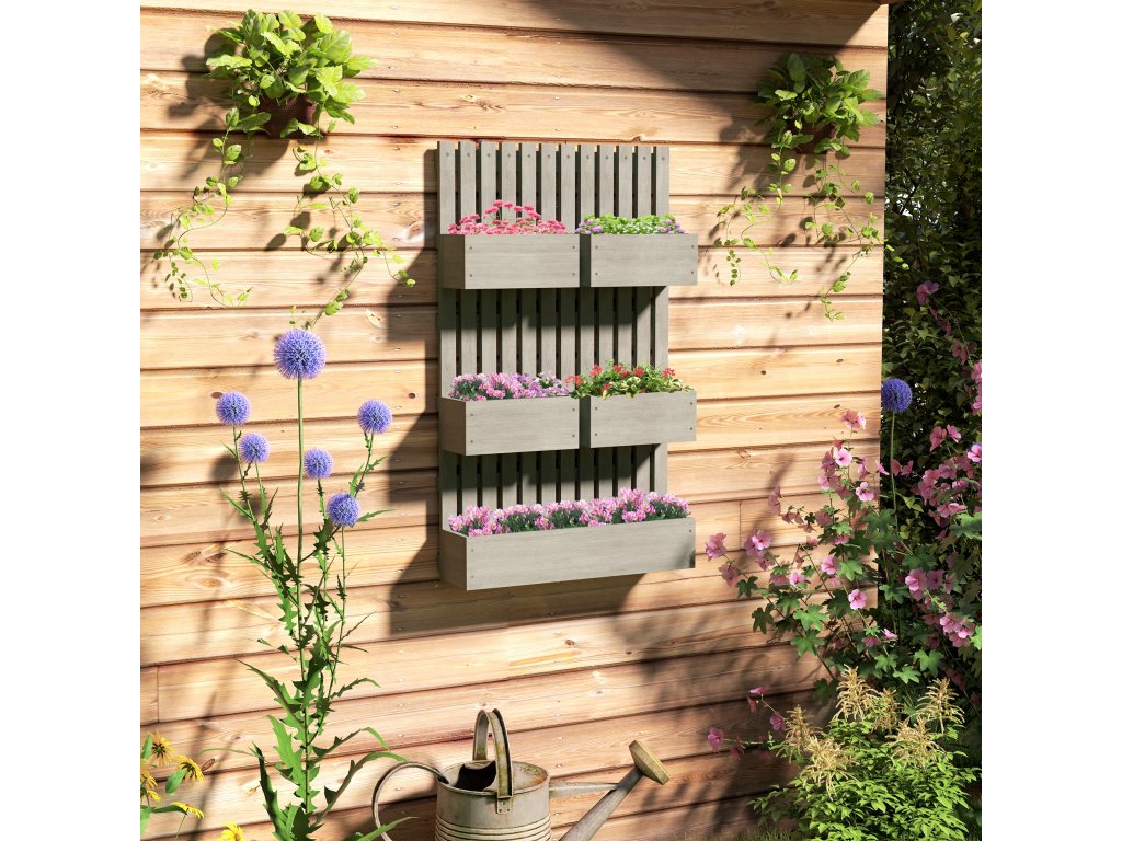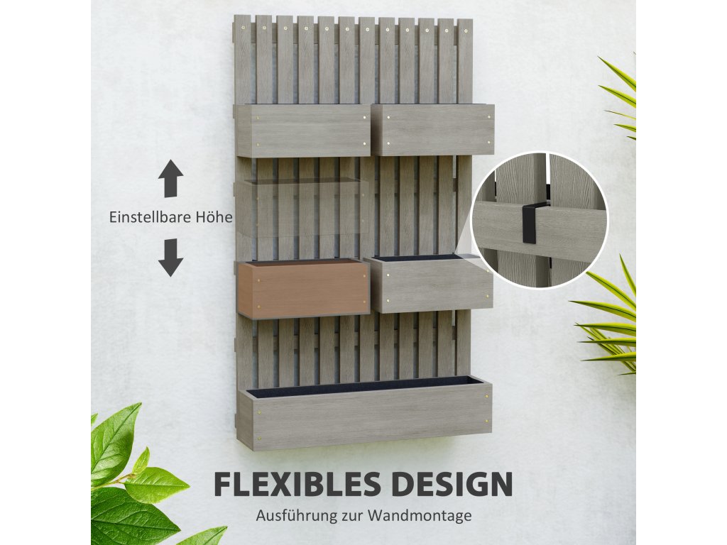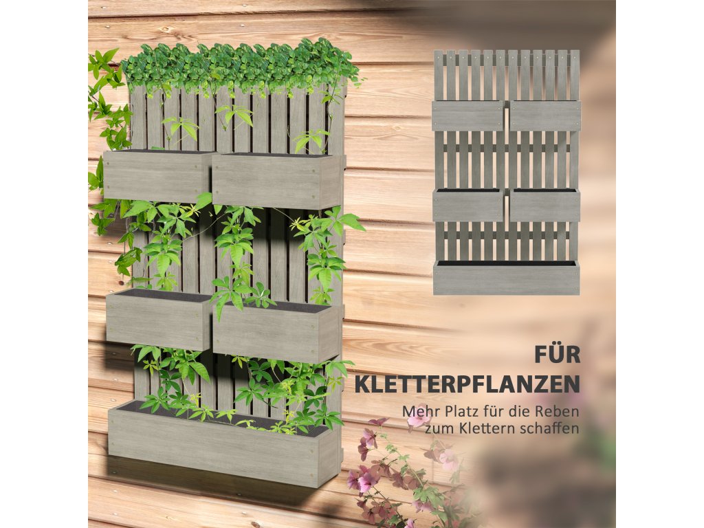 Vyvýšený záhon s treláž: Popínavé rostliny, jako je vinná réva, nacházejí optimální oporu na našich dřevěných laťkách. Okouzlující design s pěti samostatnými květináči a vzhledem připomínajícím plot dělá z našeho vyvýšeného záhonu skutečný poutač, který je umocněn praktickým panelem treláže.