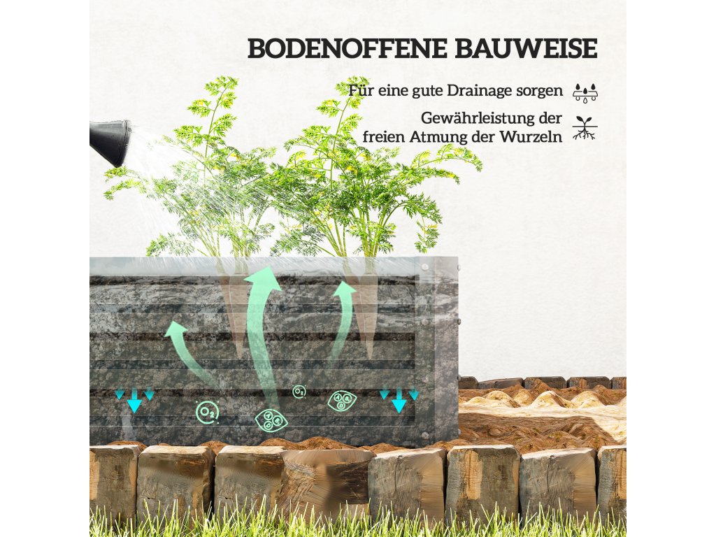 Otevřená půda pro optimální růst: Speciální konstrukce základny vyvýšených záhonů umožňuje přímý kontakt kořenů s půdou, zabraňuje zamokření a podporuje zdravé struktury rostlin a úspěšný růst.