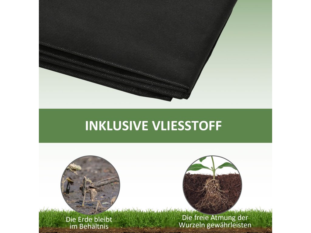 - Otevřené dno: Vyvýšený záhon má otevřené dno a je opatřen netkanou textilií, která zajišťuje dobrou drenáž a zároveň zabraňuje ztrátám půdy.