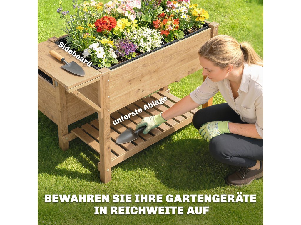 Dvě úložné plochy: Udržujte své zahradní nářadí snadno po ruce díky praktické spodní polici a boční polici. Tento vyvýšený záhon s balkonem zajišťuje lepší organizaci a snadné zahradničení.