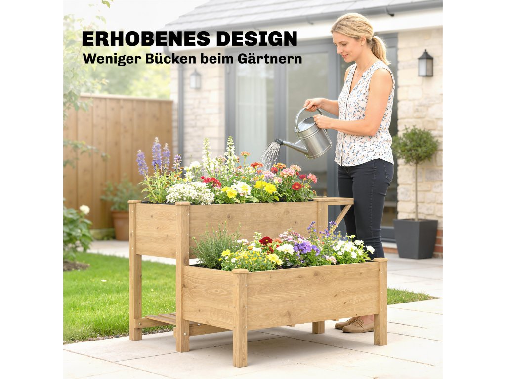 Ergonomická výška pro zahradničení: Pohodlně se starajte o své rostliny ve výšce 76,5 cm, aniž byste se museli opakovaně ohýbat. Tento dřevěný vyvýšený záhon nabízí ergonomické řešení pro zahradníky i důchodce, díky kterému bude zahradničení uvolněnější a příjemnější.